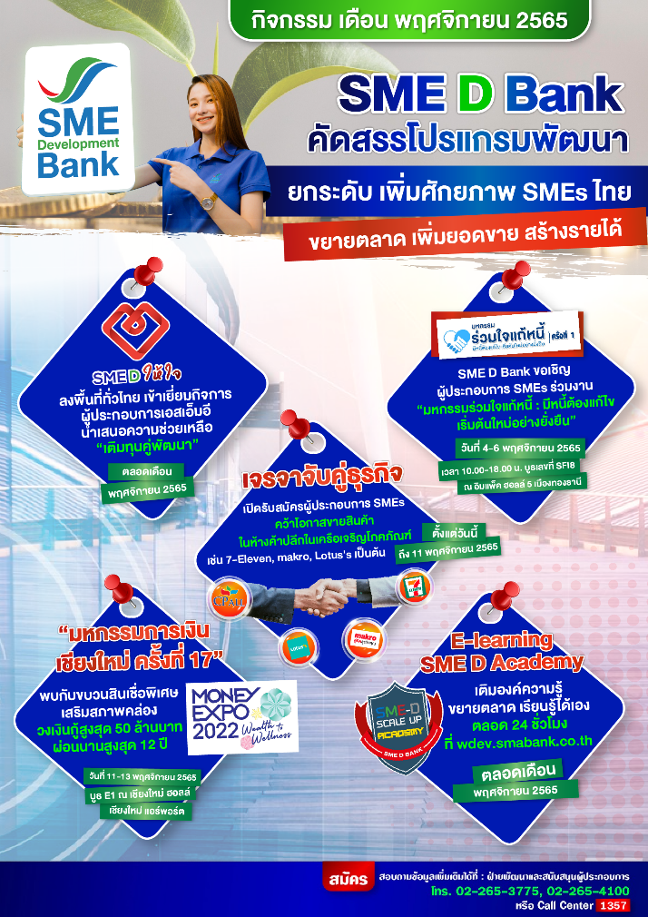 ธนาคารพัฒนาวิสาหกิจขนาดกลางและขนาดย่อมแห่งประเทศไทย (ธพว.) หรือ SME D Bank เดินหน้าภารกิจธนาคารเพื่อการพัฒนาเอสเอ็มอีไทย จัดโปรแกรมพัฒนาเอสเอ็มอีไทยครบวงจร ตลอดเดือนพฤศจิกายน 2565 เพื่อยกระดับ เพิ่มศักยภาพ ขยายตลาด เพิ่มช่องทางการขาย เดินหน้าธุรกิจคว้าโอกาสรับกำลังซื้อสุดคึกคักช่วงปลายปี ประกอบด้วย