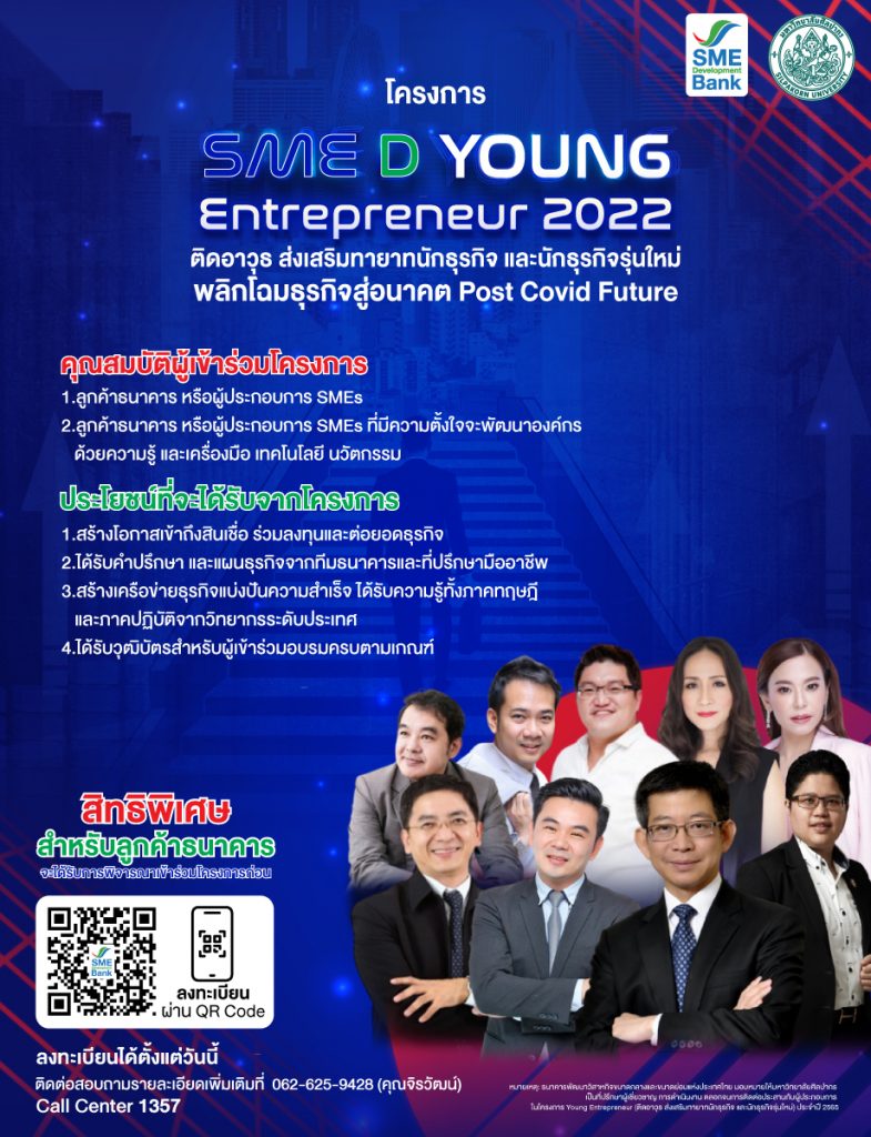 ธนาคารพัฒนาวิสาหกิจขนาดกลางและขนาดย่อมแห่งประเทศไทย (ธพว.) หรือ SME D Bank ร่วมกับ มหาวิทยาลัยศิลปากร จัดหลักสูตรอบรมออนไลน์ ภายใต้ “โครงการ SME D Young Entrepreneur ติดอาวุธ ส่งเสริมทายาทนักธุรกิจ และนักธุรกิจรุ่นใหม่” ประจำปี 2565 สนับสนุนผู้ประกอบการ SMEs ทั่วไป หรือนักธุรกิจรุ่นใหม่ที่เป็นลูกค้าธนาคาร ได้รับการเสริมสร้างศักยภาพ เติมองค์ความรู้ ทันสถานการณ์กับแนวโน้มอุตสาหกรรมสมัยใหม่ รวมถึงพัฒนาผลิตภัณฑ์สอดคล้องกับความต้องการของตลาดและผู้บริโภค ด้วยเทคโนโลยีและนวัตกรรม
