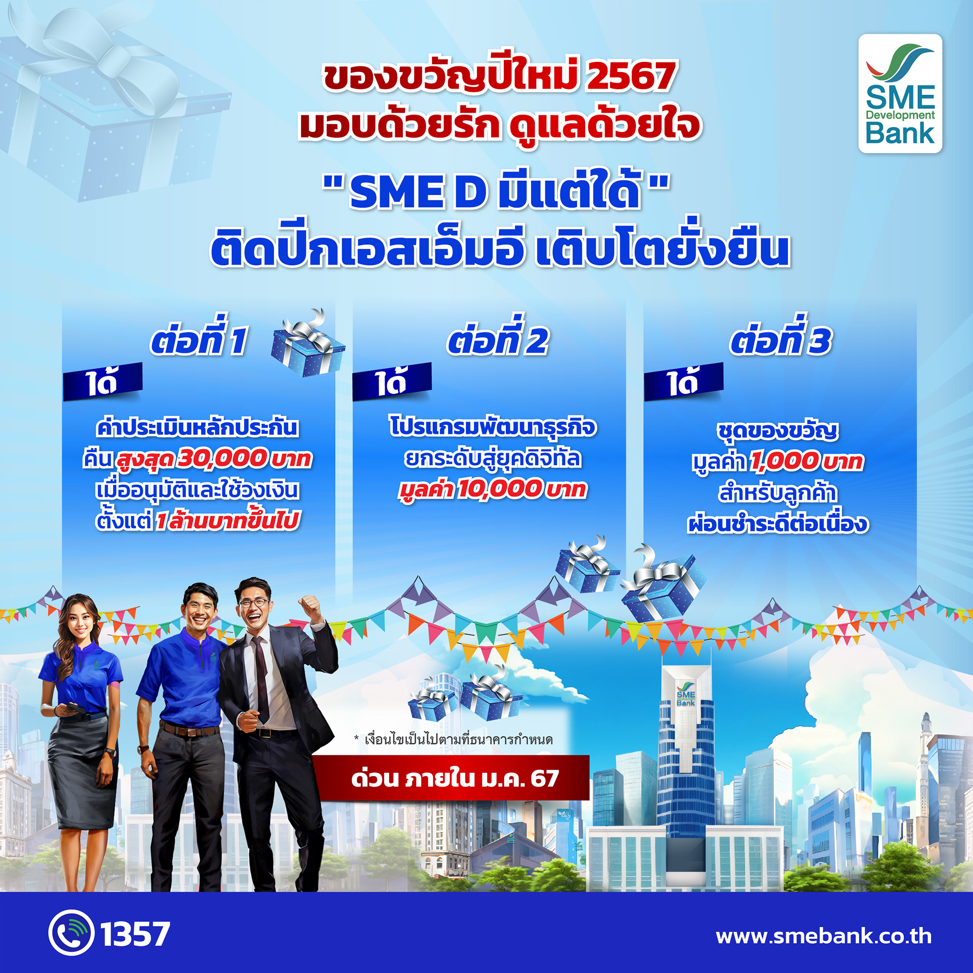SME D Bank ธนาคารเพื่อเอสเอ็มอีไทย มอบของขวัญปีใหม่ 67 จัดแคมเปญ ‘SME D มีแต่ได้’ มอบสุขเติมทุนคู่พัฒนา ติดปีกเอสเอ็มอีไทยเติบโตยั่งยืน มูลค่ารวมกว่า 4 หมื่นบาทต่อราย ทั้งฟรีค่าประเมินหลักทรัพย์ค้ำประกัน ฟรีโปรแกรมยกระดับธุรกิจ และฟรีชุดของขวัญ พร้อมมาตรการเสริมดูแลแก้ปัญหาหนี้อย่างยั่งยืนให้เอสเอ็มอีไทย แจ้งความประสงค์ภายใน ม.ค. 67