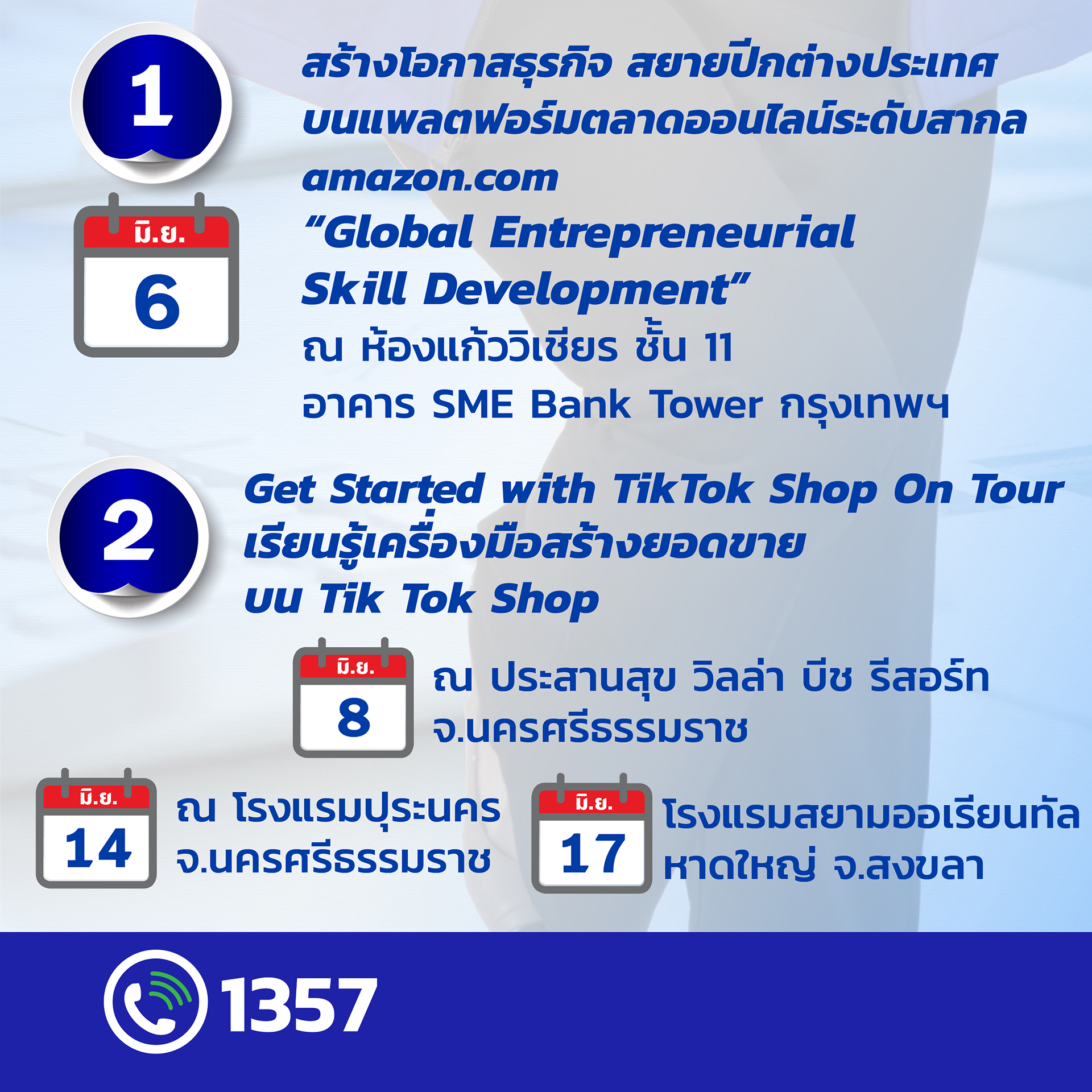 5.“Get Started with TikTok Shop On Tour” เรียนรู้เครื่องมือสร้างยอดขายบน TikTok Shop วันที่ 8 มิ.ย. 67 ณ โรงแรมประสานสุข วิลล่า บีช รีสอร์ท อ.สิชล จ.นครศรีธรรมราช วันที่ 14 มิ.ย.67 ณ โรงแรมปุระนคร อ.เมือง จ.นครศรีธรรมราช และวันที่ 17 มิ.ย.67 ณ โรงแรมสยามออเรียนทัล หาดใหญ่ จ.สงขลา
