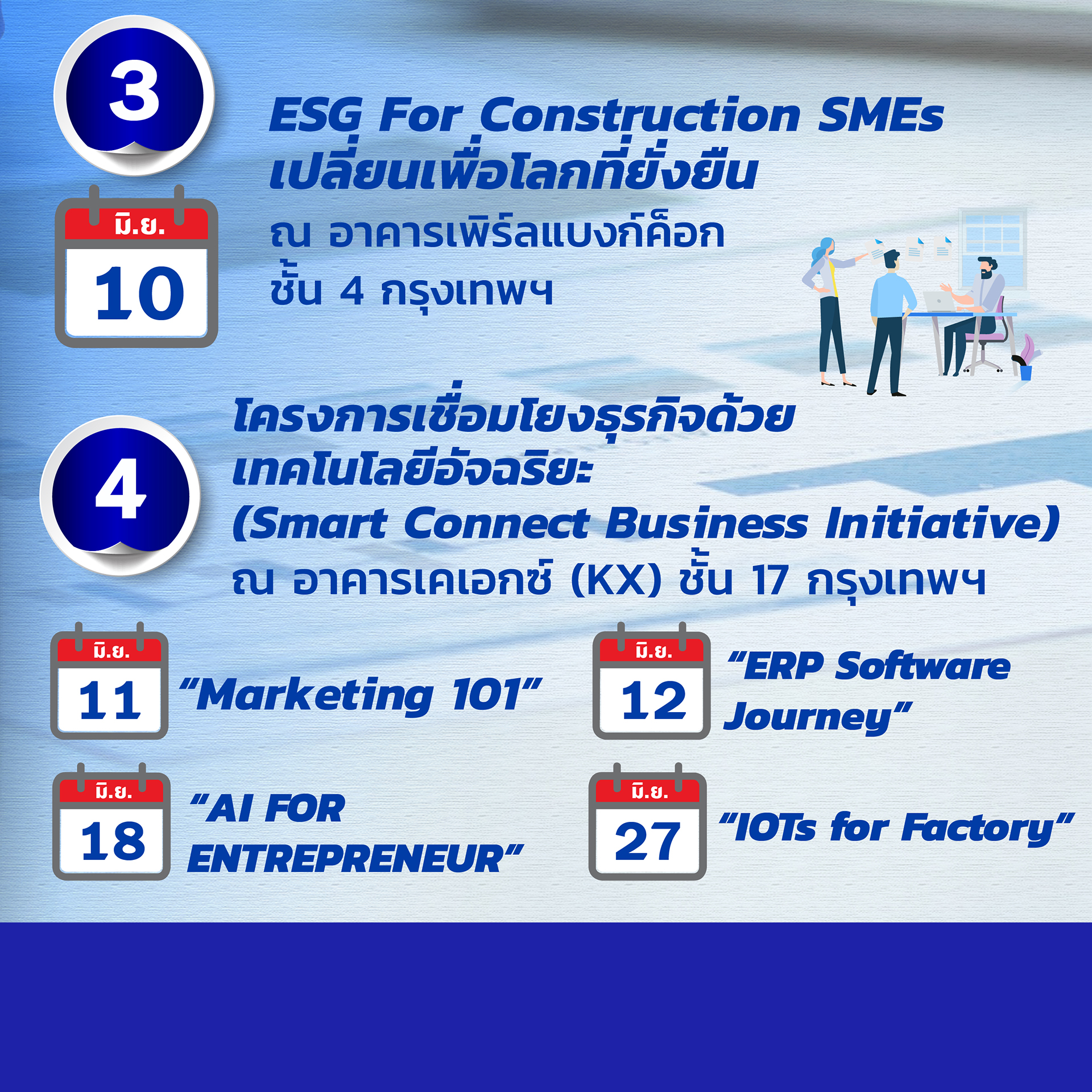 8.โครงการเชื่อมโยงธุรกิจด้วยเทคโนโลยีอัจฉริยะ “Smart Connect Business Initiative” ส่งเสริมผู้ประกอบการก้าวสู่ธุรกิจยุคใหม่ จัดทั้งหมด 4 วัน ณ อาคารเคเอกซ์ (KX) ชั้น 17 กรุงเทพฯ ได้แก่ วันที่ 11 มิ.ย.67 หัวข้อ“Marketing 101” , วันที่ 12 มิ.ย.67 หัวข้อ “ERP Software Journey” , วันที่ 18 มิ.ย.67 หัวข้อ “AI FOR ENTREPRENEUR” และ วันที่ 27 มิ.ย.67 หัวข้อ “IOTs for Factory”