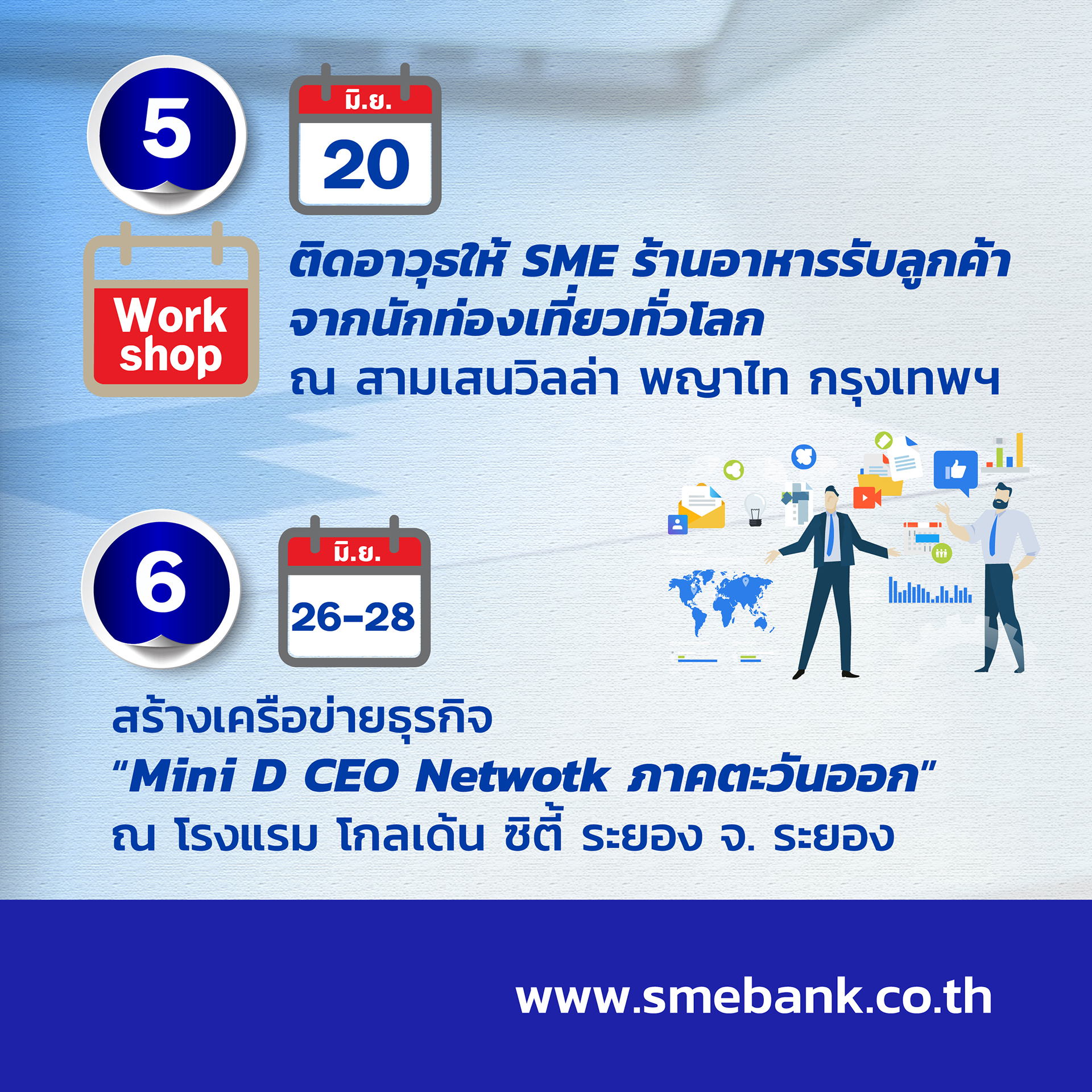 ธนาคารพัฒนาวิสาหกิจขนาดกลางและขนาดย่อมแห่งประเทศไทย (ธพว.) หรือ SME D Bank ครบเครื่องเรื่องการพัฒนา เสิร์ฟความรู้สนับสนุนผู้ประกอบการเอสเอ็มอีไทย ยกระดับธุรกิจ ตลอดเดือนมิถุนายน 2567 ผ่าน 18 โปรแกรมสุดพิเศษ ช่วยสร้างโอกาส เพิ่มยอดขาย และดันเข้าถึงแหล่งทุน ทุกโปรแกรมลงทะเบียนสมัครเข้าร่วมได้ฟรี