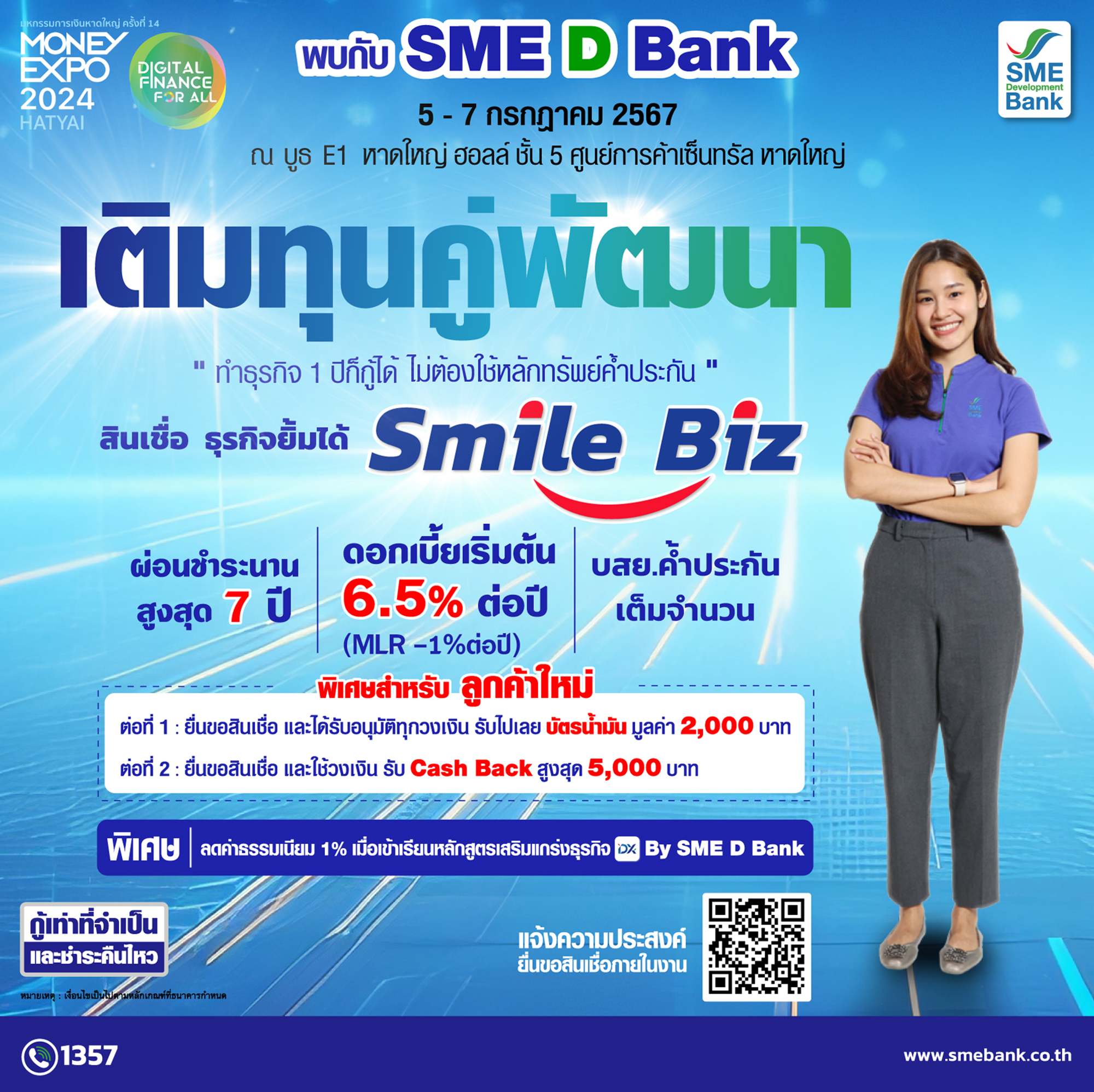 ธนาคารพัฒนาวิสาหกิจขนาดกลางและขนาดย่อมแห่งประเทศไทย (ธพว.) หรือ SME D Bank ยกทัพโปรโมชันมอบรอยยิ้มให้แก่เอสเอ็มอีแดนใต้ ในงาน “มหกรรมการเงินหาดใหญ่” ครั้งที่ 14 หรือ MONEY EXPO 2024 HATYAI ที่บูธหมายเลข E1 ระหว่างวันที่ 5-7 กรกฎาคม 2567 ภายใน หาดใหญ่ฮอลล์ ชั้น 5 ศูนย์การค้าเซ็นทรัล หาดใหญ่ พบบริการ “เติมทุนคู่พัฒนา” ไฮไลท์ สินเชื่อดอกเบี้ยถูก เงื่อนไขผ่อนปรน ทำธุรกิจ 1 ปี ก็กู้ได้ ไม่ต้องใช้หลักทรัพย์ค้ำประกัน ด้วย “สินเชื่อ Smile Biz ธุรกิจยิ้มได้” ดอกเบี้ยเริ่มต้น 6.5% ต่อปี วงเงินกู้สูงสุด 5 ล้านบาท ผ่อนนาน 7 ปี พร้อมปลอดชำระหนี้เงินต้นสูงสุด 6 เดือน พิเศษ สำหรับลูกค้าใหม่ยังไม่เคยใช้บริการสินเชื่อจาก SME D Bank มาก่อน รับสิทธิประโยชน์เพิ่ม 2 ต่อ ได้แก่ 1. ยื่นขอสินเชื่อภายในงาน และได้รับอนุมัติทุกวงเงิน รับบัตรเติมน้ำมัน มูลค่า 2,000 บาท และ 2. ยื่นขอสินเชื่อ และใช้วงเงิน รับ “Cash Back” มูลค่าสูงสุด 5,000 บาท นอกจากนั้น บริการ “พัฒนา” เสริมแกร่งธุรกิจครบวงจร ผ่านแพลตฟอร์ม “DX by SME D Bank” (dx.smebank.co.th) ช่วยต่อยอดยกระดับธุรกิจเติบโตอย่างแข็งแกร่ง โดยไม่มีค่าใช้จ่ายใดๆ ทั้งสิ้น