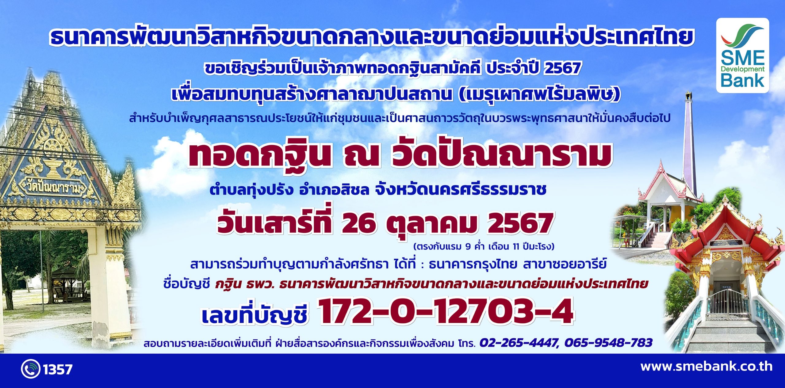 ธนาคารพัฒนาวิสาหกิจขนาดกลางและขนาดย่อมแห่งประเทศไทย (ธพว.) หรือ SME D Bank ขอเชิญชวนพุทธศาสนิกชนผู้มีจิตศรัทธา ลูกค้าธนาคาร ผู้ประกอบการเอสเอ็มอี หน่วยงานภาครัฐและเอกชน ตลอดจนประชาชนทั่วไป ร่วมบริจาคจตุปัจจัยทำบุญและร่วมเป็นเจ้าภาพทอดกฐินสามัคคี ประจำปี 2567 ในวันเสาร์ที่ 26 ตุลาคม 2567 ณ วัดปัณณาราม ตำบลทุ่งปรัง อำเภอสิชล จังหวัดนครศรีธรรมราช เพื่อสมทบทุนสร้างศาลาฌาปนสถาน (เมรุเผาศพไร้มลพิษ) สำหรับบำเพ็ญกุศลสาธารณประโยชน์ให้แก่ชุมชนและเป็นศาสนถาวรวัตถุในบวรพระพุทธศาสนาให้มั่นคงสืบต่อไป