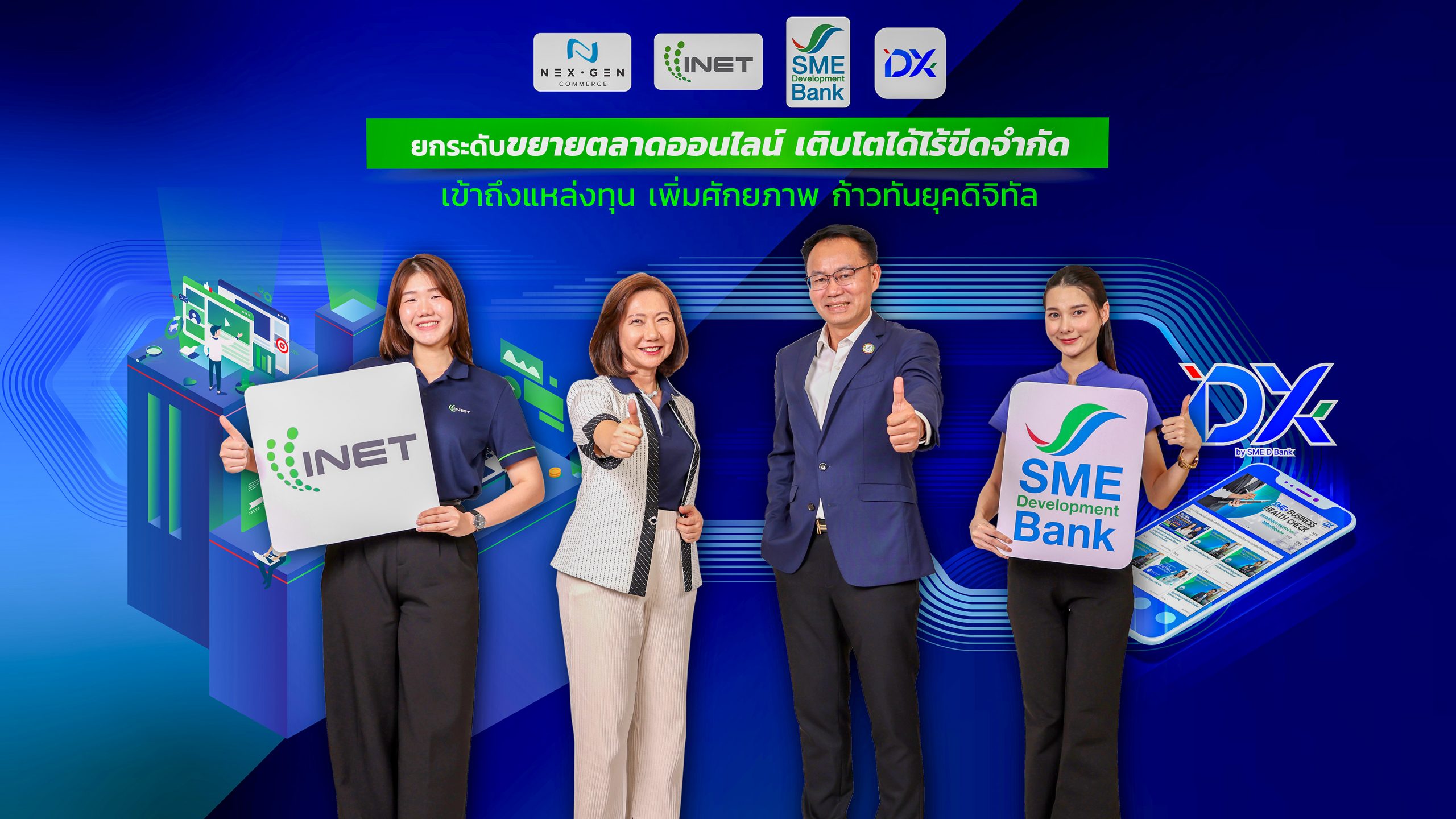 SME D Bank จับมือ INET ผู้ให้บริการแพลตฟอร์ม “Nex Gen Commerce” ช้อปปิ้งออนไลน์สัญชาติไทย ผุดโครงการเพิ่มศักยภาพเอสเอ็มอีไทยยกระดับเติบโตไร้ขีดจำกัดด้วยตลาดออนไลน์ พ่วงเปิดทางเข้าถึงแหล่งทุนอัตราดอกเบี้ยพิเศษ 3%ต่อปี พร้อมรับบริการพัฒนาครบวงจรด้วยแพลตฟอร์ม “DX by SME D Bank”