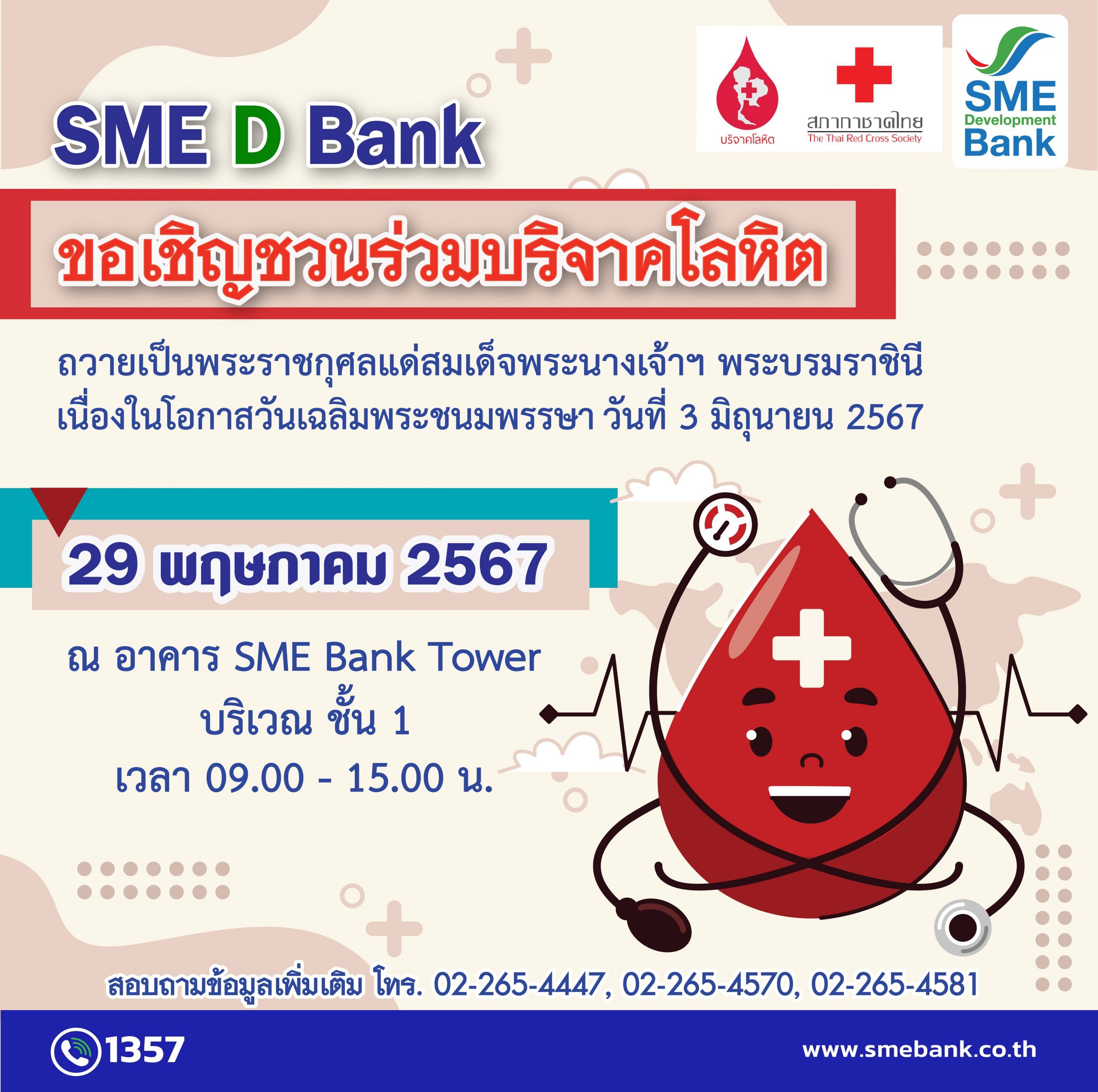 ธนาคารพัฒนาวิสาหกิจขนาดกลางและขนาดย่อมแห่งประเทศไทย (ธพว.) หรือ SME D Bank ร่วมกับ ศูนย์บริการโลหิตแห่งชาติ สภากาชาดไทย เชิญชวนลูกค้าธนาคาร และประชาชนผู้มีจิตอาสา ร่วมบริจาคโลหิต ในวันที่ 29 พฤษภาคม 2567 ณ บริเวณชั้น 1 อาคาร SME Bank Tower ตั้งแต่เวลา 09.00-15.00 น. ถวายเป็นพระราชกุศลแด่สมเด็จพระนางเจ้าฯ พระบรมราชินี เนื่องในโอกาสวันเฉลิมพระชนมพรรษา วันที่ 3 มิถุนายน  2567 โดยกิจกรรมดังกล่าว จะช่วยเติมปริมาณสำรองโลหิตให้เพียงพอต่อการรักษาพยาบาลผู้ป่วยทั่วประเทศ  นับเป็นการสร้างประโยชน์สู่สังคมและสร้างวัฒนธรรมแห่งการเอื้อเฟื้อแบ่งปันซึ่งกันและกัน  นำไปสู่สังคมความแห่งความสุขอย่างยั่งยืน สอดคล้องตามแนวทาง ESG (Environmental , Social and Governance)  สอบถามข้อมูลเพิ่มเติมได้ที่ฝ่ายสื่อสารองค์กรและกิจกรรมเพื่อสังคม โทร. 02-265-4447, 02-265-4570, 02-265-4581 หรือ Call Center 1357
