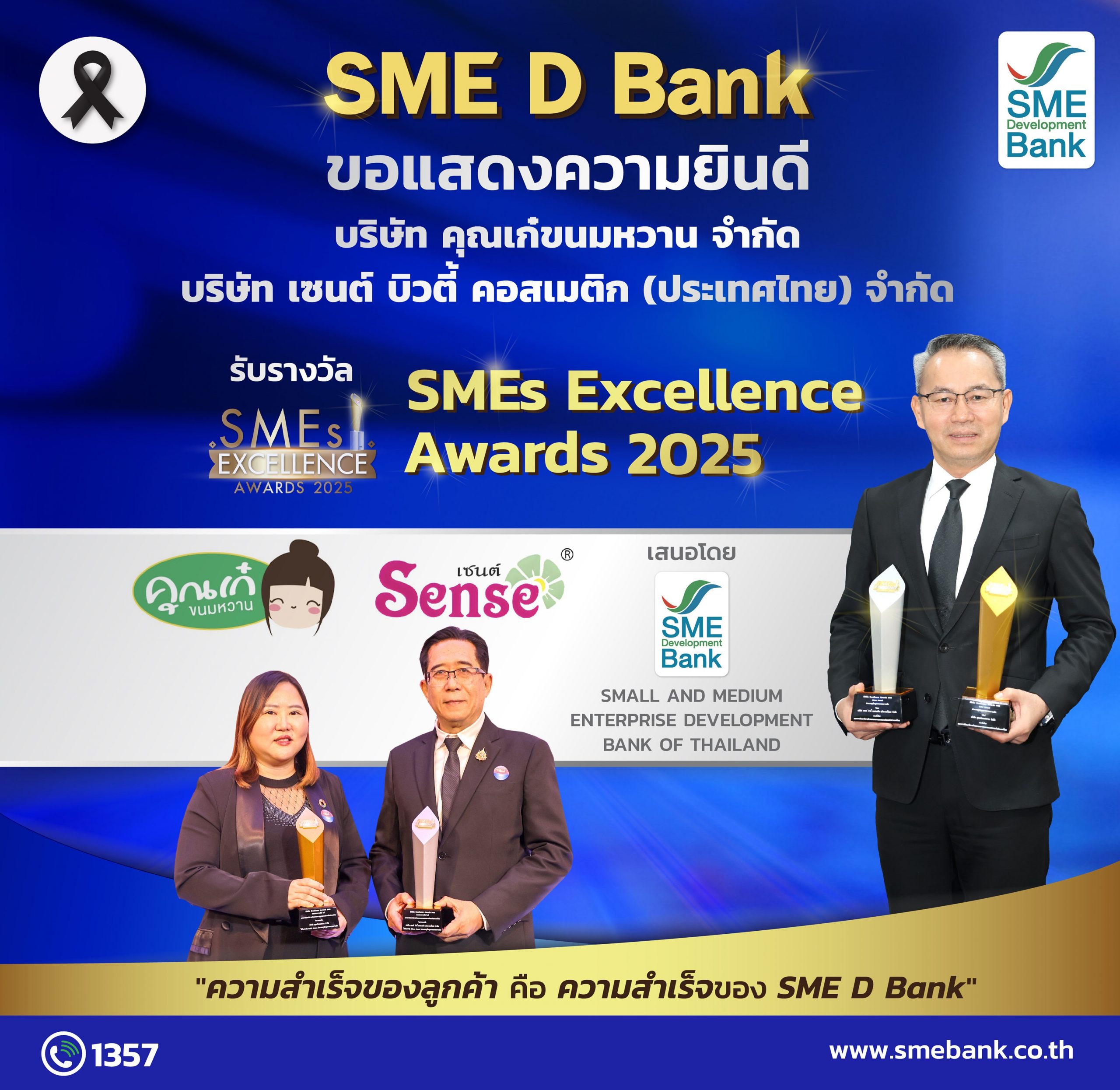 นายพิชิต มิทราวงศ์ กรรมการผู้จัดการ ธนาคารพัฒนาวิสาหกิจขนาดกลางและขนาดย่อมแห่งประเทศไทย (ธพว.) หรือ SME D Bank กล่าวว่า SME D Bank มีความยินดีอย่างยิ่งกับลูกค้าธนาคาร ได้แก่ บริษัท คุณเก๋ขนมหวาน จำกัด ผู้ผลิตขนมไทยที่มีรูปแบบหลากหลาย แบรนด์ “คุณเก๋ขนมหวาน” กับ บริษัท เซนต์ บิวตี้ คอสเมติก (ประเทศไทย) จำกัด ผู้ผลิตและจัดจำหน่ายผลิตภัณฑ์เพื่อสุขภาพและความงามจากสมุนไพร แบรนด์ “ชีววิถี” และ “Sense” ได้รับรางวัลทรงเกียรติ “SMEs Excellence Awards 2025” ในงาน TMA Excellence Awards 2025 ซึ่งมอบให้แก่ผู้ประกอบการที่มีความโดดเด่นในการดำเนินธุรกิจ