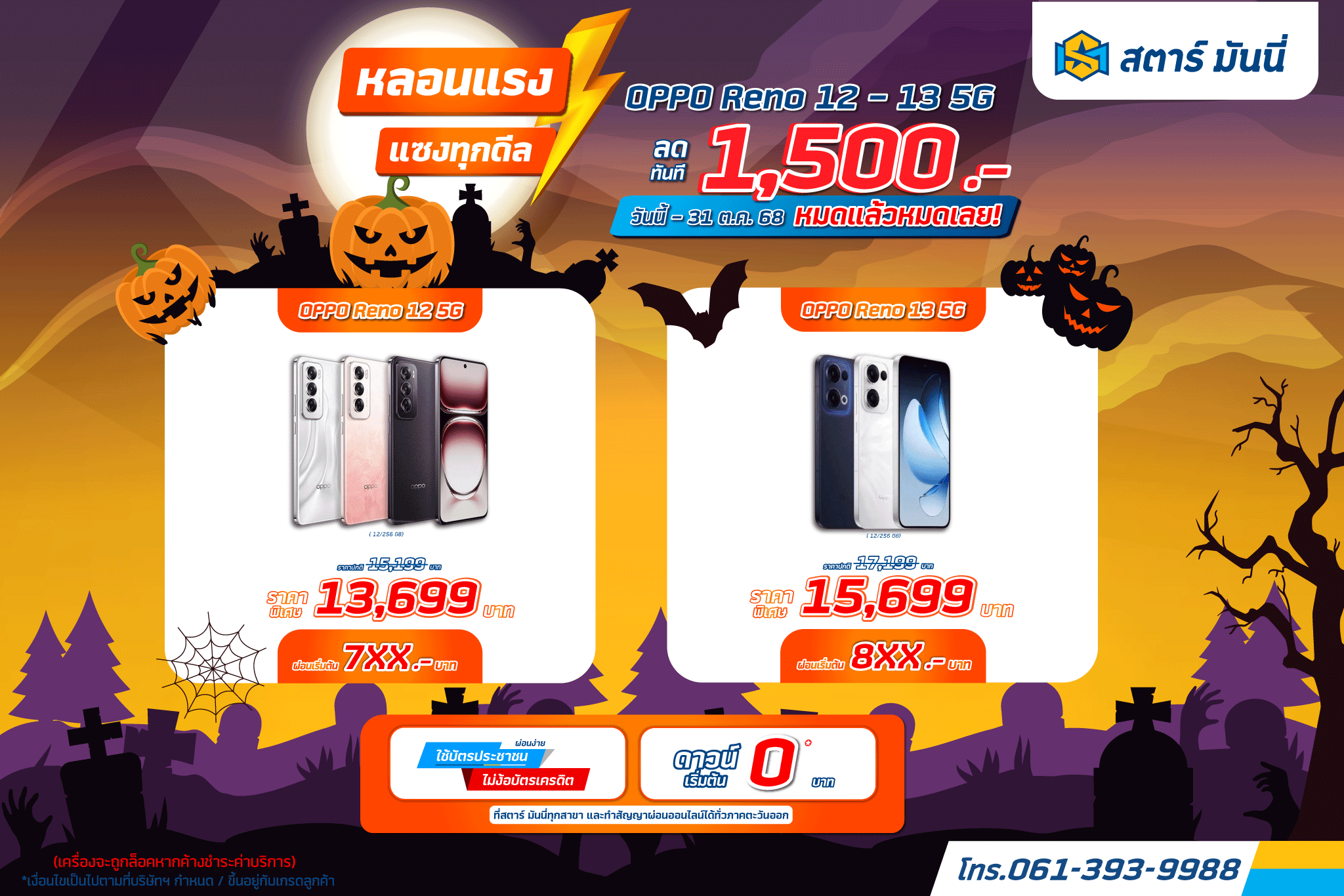 บมจ.สตาร์ มันนี่ (STARM) เสิร์ฟโปรแรงรับฮาโลวีนแบบไม่กลัวผี! ออกแคมเปญเอาใจสายช้อปมือถือ เพียงซื้อ OPPO Reno 12 หรือ Reno 13 5G รับส่วนลดทันที 1,500 บาท แถมโปรสุดใจดี “ดาวน์ 0 บาท* รับเครื่องกลับบ้านได้เลย” แคมเปญนี้จัดเต็มตั้งแต่วันนี้ถึง 31 ต.ค. 2568 ทุกสาขาของ STARM พร้อมเปิดช่องทาง ทำสัญญาผ่อนออนไลน์ สำหรับลูกค้าภาคตะวันออก สะดวก รวดเร็ว ไม่ต้องเดินทาง…โปรแรงช่วงเทศกาลแบบนี้ คาดช่วยเพิ่มยอดขายมือถือ และหนุนยอดปล่อยสินเชื่อให้โตต่อเนื่องในโค้งสุดท้ายแน่นอนคร้า!!