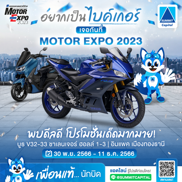 ซัมมิท แคปปิตอล ลีสซิ่ง ขอเชิญชวนเยี่ยมชมบูธซัมมิท แคปปิตอล ลีสซิ่ง ในงานมหกรรมยานยนต์ระดับประเทศ Motor Expo ครั้งที่ 40 ตั้งแต่วันที่ 30 พฤศจิกายน – 11 ธันวาคม 2566 นี้ พบกับ 2 แคมเปญหลัก แคมเปญแรก สิทธิประโยชน์พิเศษ ที่ไม่เหมือนใคร เมื่อผ่อนรถมอเตอร์ไซค์กับซัมมิท แคปปิตอล ลีสซิ่ง วันนี้ พร้อมแพคเกตสุดพิเศษบริการช่วยเหลือบนท้องถนน 24 ชั่วโมง เบอร์ Call Center พิเศษ และฟรีประกันรถหายและอุบัติเหตุส่วนบุคคล คุ้มครองสูงสุด 2 แสนบาท เอกสิทธิ์เฉพาะลูกค้าซัมมิท แคปปิตอล ลีสซิ่งเท่านั้น* และแคมเปญพิเศษร่วมรักษาสิ่งแวดล้อมกับโครงการซัมมิท แคปปิตอล รักษ์โลก โดยเราจะนำรายได้ส่วนหนึ่งจากทุกรายสัญญา ไปสมทบทุนในการปลูกป่าชายเลน เพื่อช่วยดูดซับก๊าซคาร์บอนไดออกไซด์ และคืนอากาศบริสุทธิ์สู่โลก