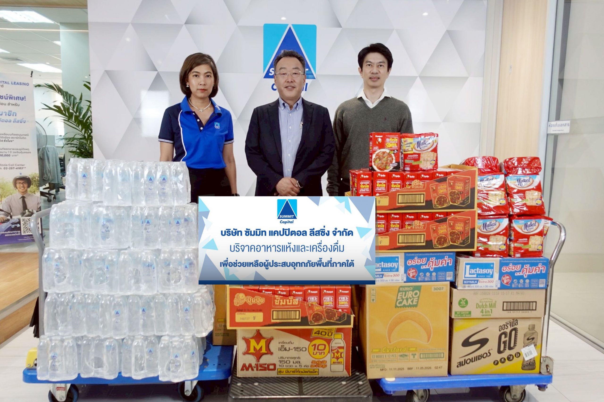 คุณโยซูเกะ อูนิกาเมะ ประธานบริษัทและประธานเจ้าหน้าที่บริหาร (กลาง) พร้อมด้วยคณะผู้บริหาร บริษัท ซัมมิท แคปปิตอล ลีสซิ่ง จำกัด ร่วมส่งมอบน้ำดื่มจำนวน 500 ขวด อาหารแห้ง เครื่องดื่ม และของใช้จำเป็น ให้แก่ กองทัพเรือ เพื่อนำไปกระจายสู่พื้นที่ประสบภัยต่าง ๆ ในพื้นที่ภาคใต้ตามความเร่งด่วน โดยมีเป้าหมายเพื่อบรรเทาความเดือดร้อนในเบื้องต้น และช่วยให้ประชาชนสามารถดำรงชีพได้ในช่วงสถานการณ์ฉุกเฉิน