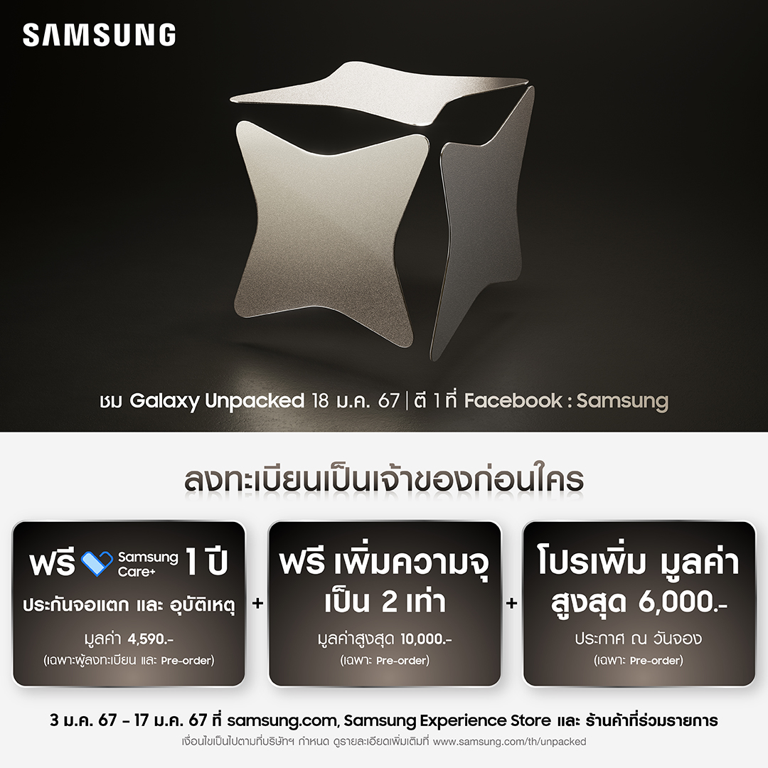เตรียมตัวให้ดี ซัมซุงจะพาทุกคนนั่งไทม์แมชชีนสู่โลกสุดล้ำในงาน Galaxy Unpacked วันที่ 18 มกราคมนี้ เวลา 01.00 น. Live สดส่งตรงจากสหรัฐอเมริกา ชมพร้อมกันได้ที่ Facebook ของ Samsung จากนั้นมาสัมผัสเครื่องจริง ฟีเจอร์ใหม่ และทดลองใช้เทคโนโลยีที่จะทำให้ชีวิตง่ายขึ้น ของซัมซุง กาแล็คซี่ได้ที่ Galaxy Experience Space พื้นที่แห่งนวัตกรรมสุดล้ำในเมืองไทยพร้อมตื่นตาตื่นใจกับ 6 กิจกรรมเน้นๆ และเซอร์ไพรส์อีกมากมายที่ห้างสรรพสินค้าเซ็นทรัลลาดพร้าว ชั้น 1 โซน C ตั้งแต่ 18 มกราคม ถึง 11 กุมภาพันธ์ 2567 แล้วจะรู้ว่าชีวิตที่มี Galaxy AI นั้นดีกว่ายังไง!