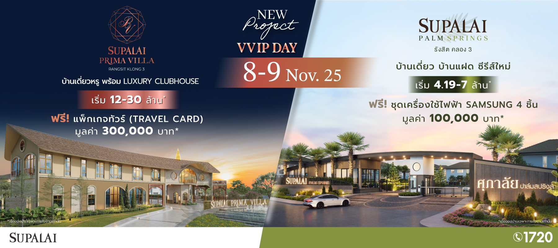 สัมผัสโอกาสพิเศษแห่งการใช้ชีวิตเหนือระดับก่อนใคร กับ 2 โครงการคุณภาพจากศุภาลัยพบกันในงาน “VVIP DAY” วันที่ 8–9 พฤศจิกายนนี้ พร้อมข้อเสนอสุดพิเศษเฉพาะภายในงาน เมื่อจองบ้านเดี่ยวหรูระดับพรีเมียม ศุภาลัย พรีมา วิลล่า รังสิต คลอง 3 ราคาเริ่มต้น 12-30 ล้านบาท รับทันที ฟรี! แพ็กเกจท่องเที่ยว (Travel Card) มูลค่า 300,000 บาท หรือเลือกจองบ้านเดี่ยว–บ้านแฝดซีรีส์ใหม่ ศุภาลัย ปาล์มสปริงส์ รังสิต คลอง 3 ราคาเริ่มต้น 4-7 ล้านบาท พร้อมรับ ฟรี! ชุดเครื่องใช้ไฟฟ้า SAMSUNG 4 ชิ้น มูลค่า 100,000 บาท