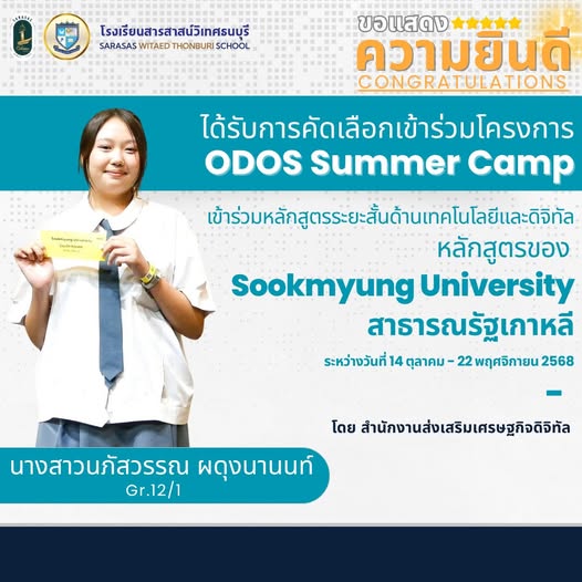 โรงเรียนสารสาสน์วิเทศน์ธนบุรี ขอแสดงความยินดีกับนักเรียนคนเก่ง นางสาวนภัสวรรณ ผดุงนานนท์  Gr.12/1 ตัวแทนจาก 878 อำเภอทั่วประเทศ และ 50 เขตในกรุงเทพมหานคร ได้รับการคัดเลือกเข้าร่วมโครงการ ODOS Summer Camp เข้าร่วมหลักสูตรระยะสั้นด้านเทคโนโลยีและดิจิทัล ณ สถาบันการศึกษาชั้นนำในต่างประเทศหลักสูตรของ Sookmyung University สาธารณรัฐเกาหลีระหว่างวันที่ 14 ตุลาคม-22 พฤศจิกายน 2568 โดย สำนักงานส่งเสริมเศรษฐกิจดิจิทัล เมื่อวันที่ 1 สิงหาคม พ.ศ. 2568 ที่ผ่านมา