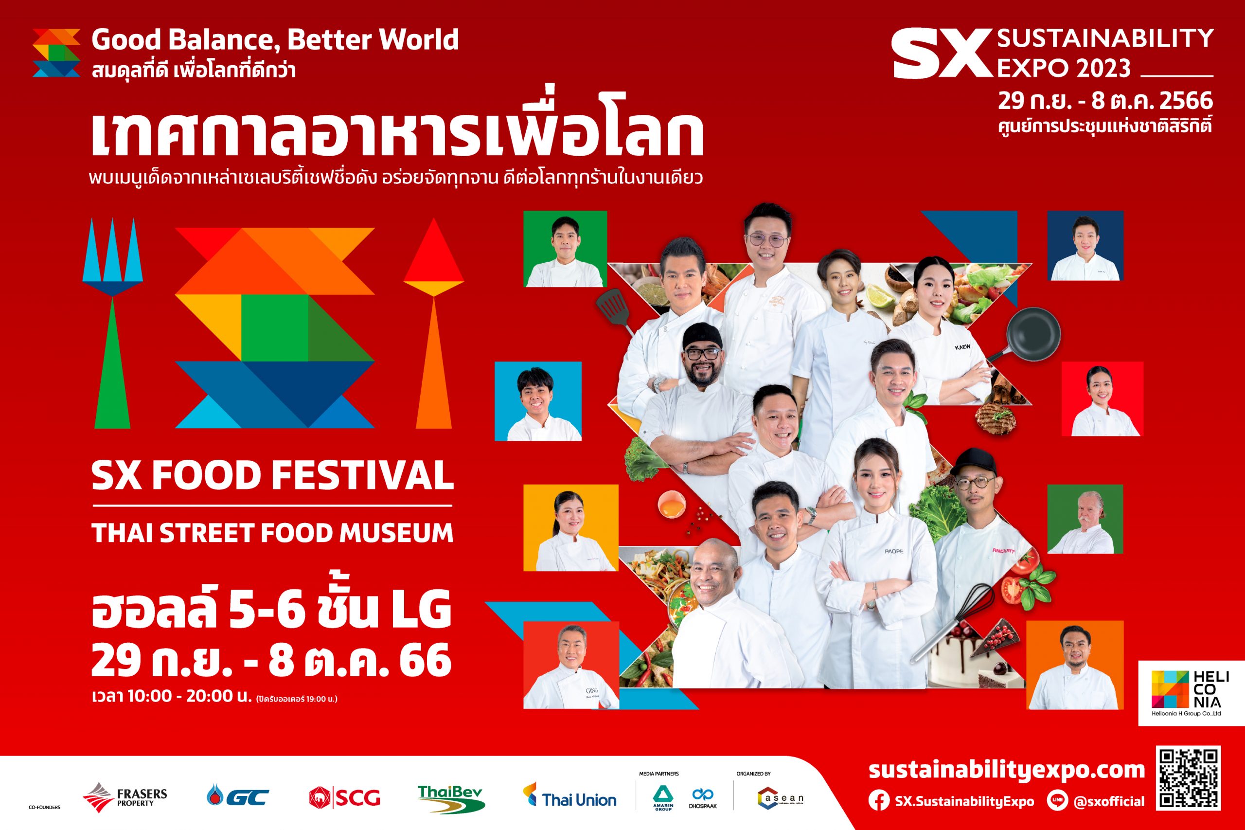 เทศกาลอาหารเพื่อโลกแห่งปี !!! SX FOOD FESTIVAL 2023 ภายใต้มหกรรมด้านความยั่งยืนที่ใหญ่ที่สุดในอาเซียน SUSTAINABILITY EXPO 2023 (SX2023) นับถอยหลังเตรียมต้อนรับนักกินสายรักษ์โลก เข้าสู่ดินแดนแห่งความอร่อยที่ยั่งยืน พร้อมเนรมิตพื้นที่มากกว่า 10,000 ตารางเมตร ให้กลายเป็นแหล่งรวมจานเด็ด ร้านดัง ในบรรยากาศร่วมสมัย สไตล์ไทยเรโทร ของย่านต่าง ๆ ในกรุงเทพฯ และมุมเมือง/ต่างจังหวัด ภายใต้แนวคิด THAI STREET FOOD MUSEUM : ไทยสตรีทฟู้ด ไทยสตรีทกู้ด ดีต่อไทย ดีต่อโลก พลาดไม่ได้กับการรวมตัวครั้งสำคัญของเหล่าเซเบลริตี้เชฟชื่อดัง อาทิ เชฟอ๊อฟ – ณัฐวุฒิ ธรรมพันธุ์ เชฟพฤกษ์ – พฤกษ์ สัมพันธวรบุตร เชฟบิ๊ก – อรรถสิทธิ์ พัฒนเสถียรกุล เชฟพลอย – ณัฐณิชา บุญเลิศ เชฟแก้ว – ปวีณ์นุช ยอดปรีชาวิจิตร และอีกมากมาย ผนึกกำลังร่วมสร้างสรรค์เมนูอาหารจานพิเศษ ครบครันทั้งคาวและหวาน ที่ดีต่อคุณ ดีต่อไทย ดีต่อโลก ตามแบบฉบับ Zero-Waste Cooking หรือการปรุงแต่งอาหารแบบปราศจากขยะอาหารเหลือทิ้งเพื่อความยั่งยืนแบบเต็มรูปแบบ นอกจากนี้ ยังมีร้านอาหารชั้นนำอื่น ๆ ที่น่าสนใจอีกมากมาย รวมแล้วกว่า 120 ร้านค้า มาร่วมกิจกรรมออกบูธจำหน่ายอาหารและเครื่องดื่มในงานครั้งนี้อีกด้วย