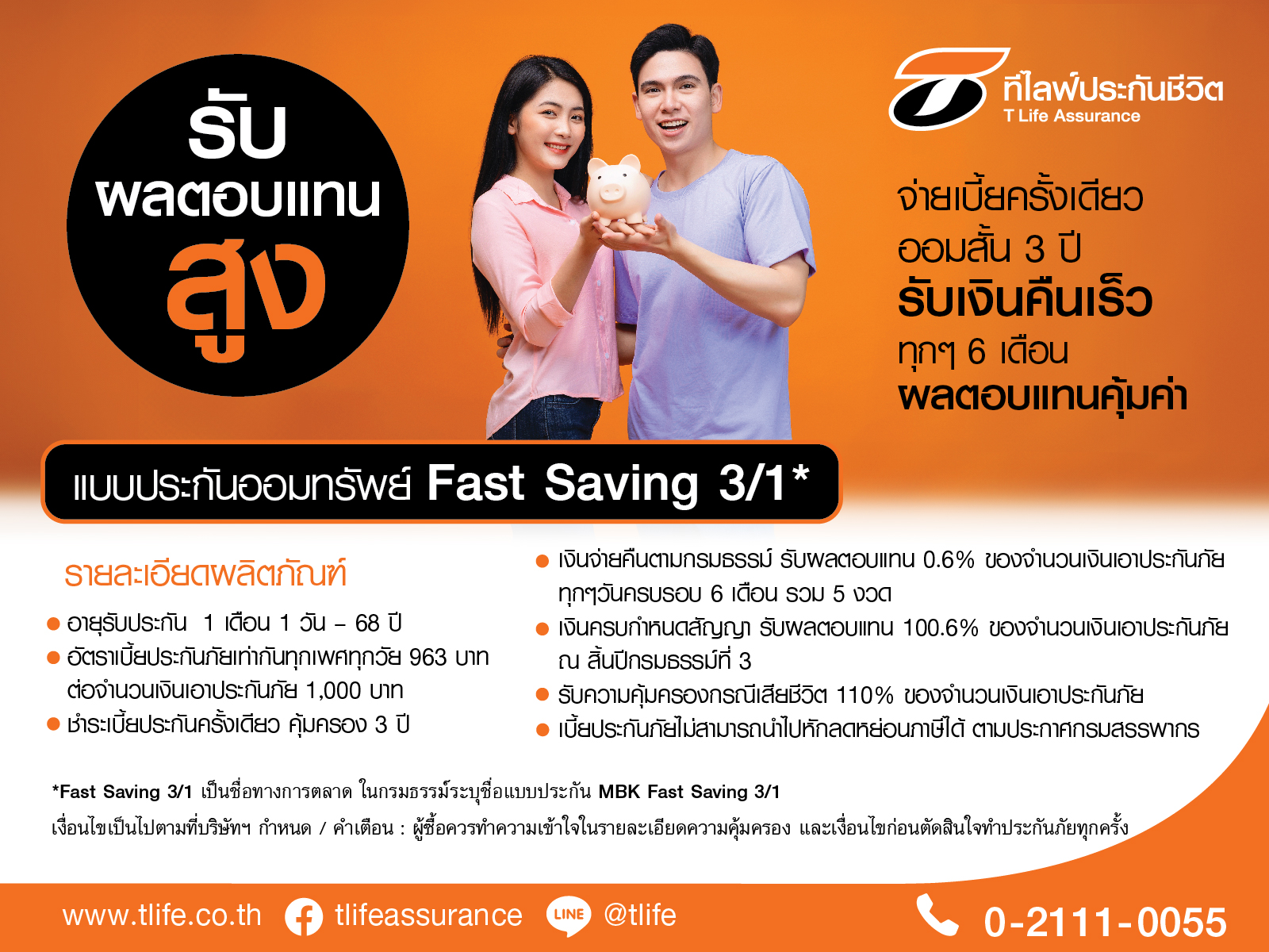 “ที ไลฟ์ ประกันชีวิต” รุกประกันออมทรัพย์ ออก “ประกันออมทรัพย์ Fast Saving 3/1” ออม 3 ปี เบี้ยประกัน 100,000-5,000,000 บาท รับเงินคืนเร็วทุกๆ 6 เดือน รับผลประโยชน์ทั้งหมดเมื่อครบกำหนดสัญญา 103.6% ของจำนวนเงินเอาประกันภัย โดยผลประโยชน์ไม่ต้องเสียภาษี หรือ ผลตอบแทน 3 ปี สูงถึง 2.94% ต่อปี เมื่อเปรียบเทียบกับเงินฝากประจำของธนาคารพาณิชย์ พร้อมรับความคุ้มครองกรณีเสียชีวิต 110% ของจำนวนเงินเอาประกันภัย