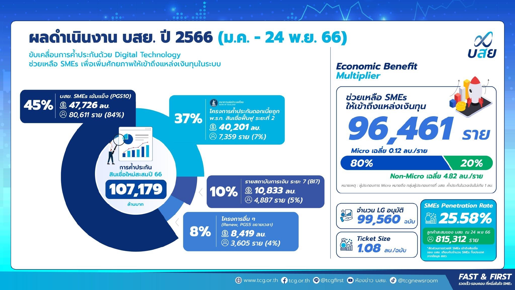 สำหรับผลดำเนินงาน บสย. ในช่วง 11 เดือน ณ 24 พ.ย. 2566 ถือว่า สำเร็จตามเป้า ทั้งด้านการค้ำประกันการแก้หนี้ ผ่าน “บสย. พร้อมช่วย” การให้คำปรึกษาทางการเงิน SMEs มีการขยายตัว ด้านผลดำเนินงานด้านค้ำประกันสินเชื่อ อนุมัติค้ำประกันวงเงิน 107, 179 ล้านบาท ช่วยผู้ประกอบการSMES ได้สินเชื่อ 96,461 ราย (80% ของจำนวนราย SMEs เป็นผู้ประกอบการกลุ่ม Micro) สร้างผลประโยชน์ทางเศรษฐกิจ 442,649 ล้านบาท สร้างสินเชื่อในระบบ 117,597 ล้านบาท รักษาการจ้างงาน 811,239 ตำแหน่ง มีฐานลูกค้า SMEร สะสมรวมกว่า 815,312 ราย