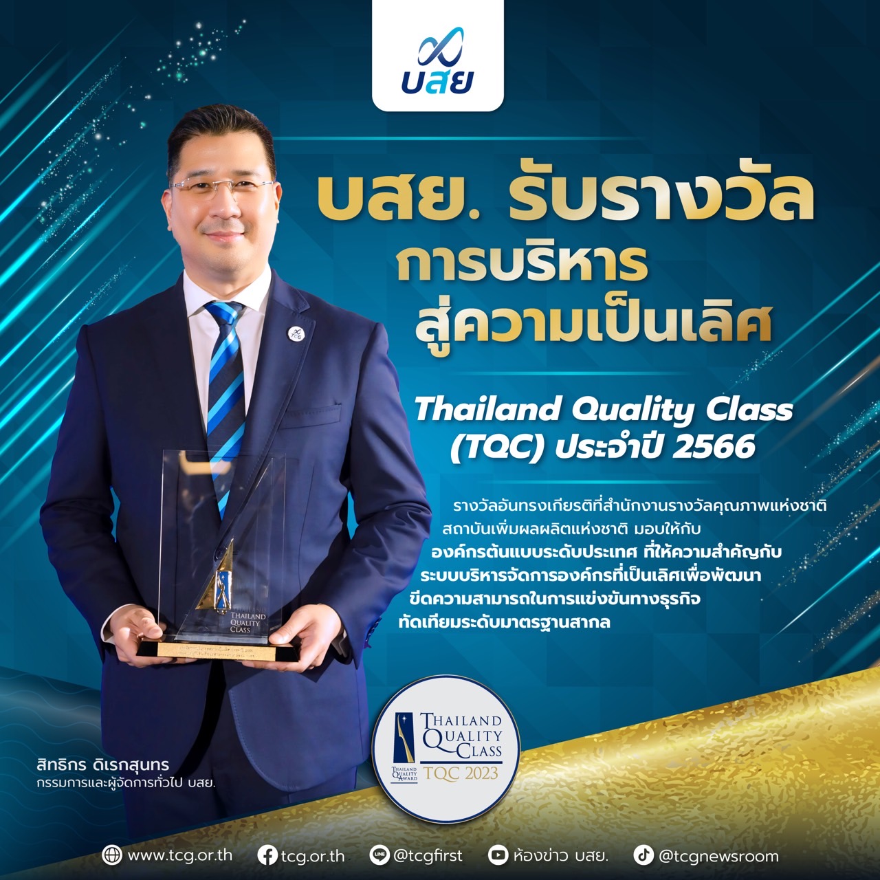 นายสิทธิกร ดิเรกสุนทร กรรมการและผู้จัดการทั่วไป บรรษัทประกันสินเชื่ออุตสาหกรรมขนาดย่อม (บสย.) รับรางวัล Thailand Quality Class : TQC 2023 การบริหารสู่ความเป็นเลิศ จากนางสาวพิมพ์ภัทรา วิชัยกุล รัฐมนตรีว่าการกระทรวงอุตสาหกรรม เป็นประธานในพิธีมอบรางวัลคุณภาพแห่งชาติ ครั้งที่ 22 ประจำปี 2566 (Thailand Quality Award : TQA) จัดโดยกระทรวงอุตสาหกรรม โดยสถาบันเพิ่มผลผลิตแห่งชาติ ในฐานะสำนักงานรางวัลคุณภาพแห่งชาติ โดยมีนายปิยะบุตร ชลวิจารณ์ ประธานคณะกรรมการรางวัลคุณภาพแห่งชาติ นายสุวรรณชัย โลหะวัฒนกุล ผู้อำนวยการสถาบันเพิ่มผลผลิตแห่งชาติ ในฐานะกรรมการและเลขานุการรางวัลคุณภาพแห่งชาติ พร้อมด้วยคณะผู้บริหารบรรษัทประกันสินเชื่ออุตสาหกรรมขนาดย่อม (บสย.) ร่วมแสดงความยินดี ณ หอประชุมใหญ่ ศูนย์วัฒนธรรมแห่งประเทศไทย เมื่อวันที่ 6 มีนาคม 2567