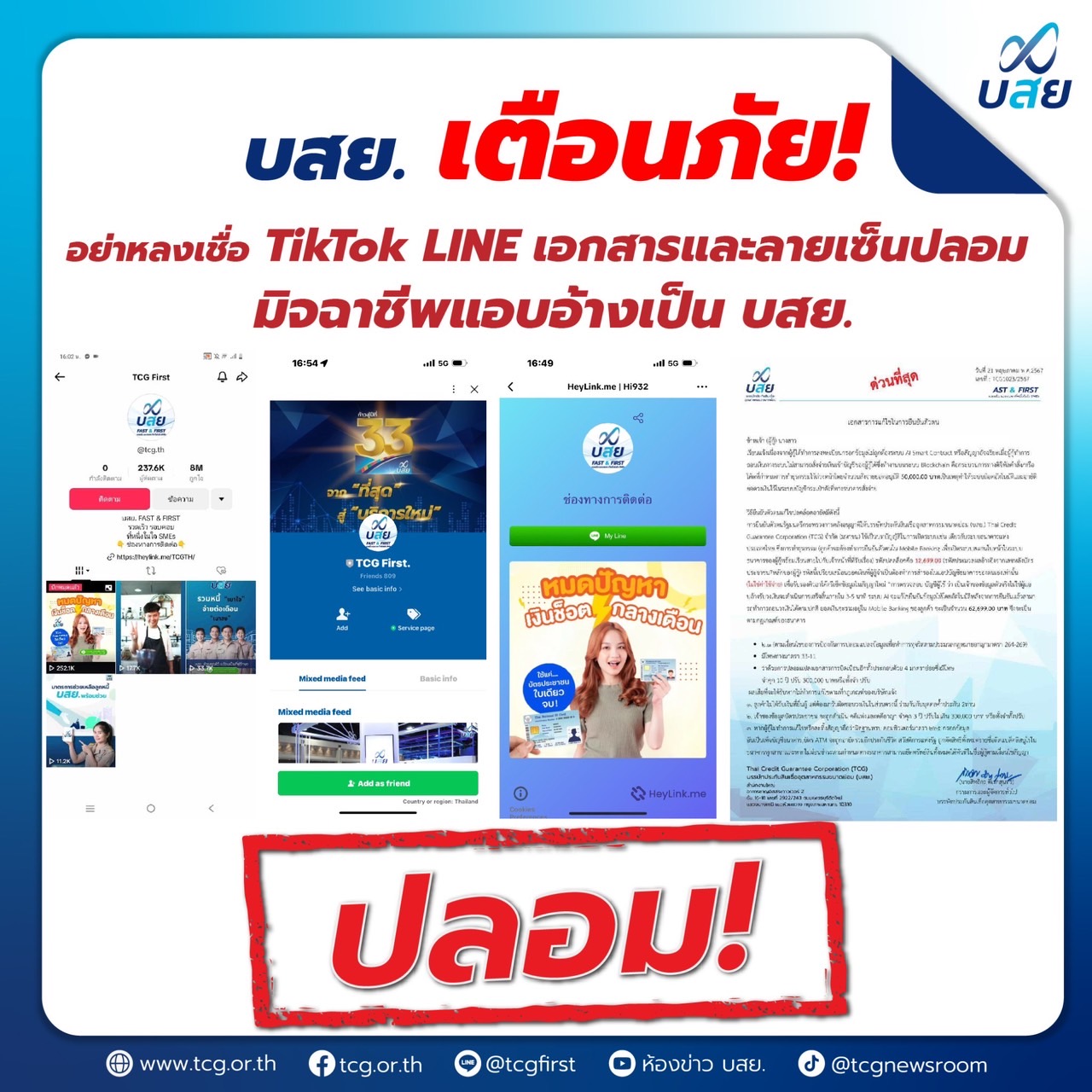 บรรษัทประกันสินเชื่ออุตสาหกรรมขนาดย่อม (บสย.) ขอแจ้งเตือน กรณีมีมิจฉาชีพสร้าง TikTok LINE และเอกสารปลอม แอบอ้างเป็น บสย. เพื่อหลอกลวงประชาชน