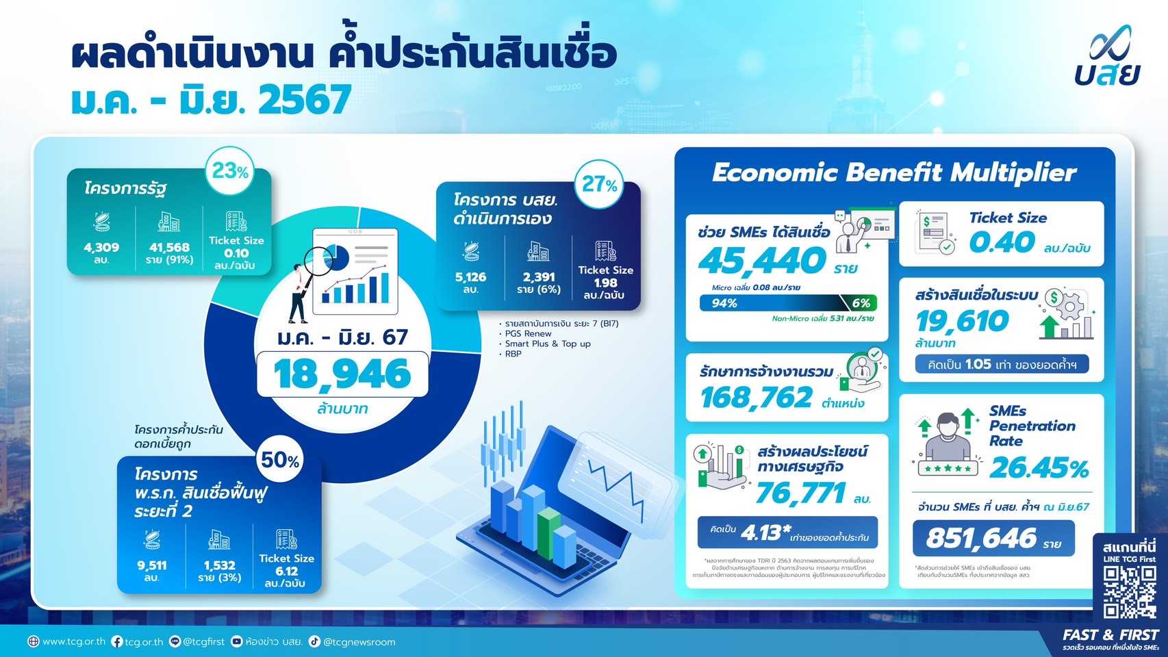 บสย. เร่งฟื้น SMEs ม.ค.-มิ.ย. 67 ค้ำแล้ว 18,946 ล้านบาท ชูแผนครึ่งปีหลัง เร่งค้ำ ต่อเนื่อง มั่นใจ “บสย. SMEs ยั่งยืน” ครึ่งปีหลัง ช่วย SMEs ได้สินเชื่อกว่า 30,000 ราย มั่นใจมาตรการรัฐ “ฟรีค่าธรรมเนียม 2-4 ปีแรก” หนุนแบงก์ปล่อยสินเชื่อ