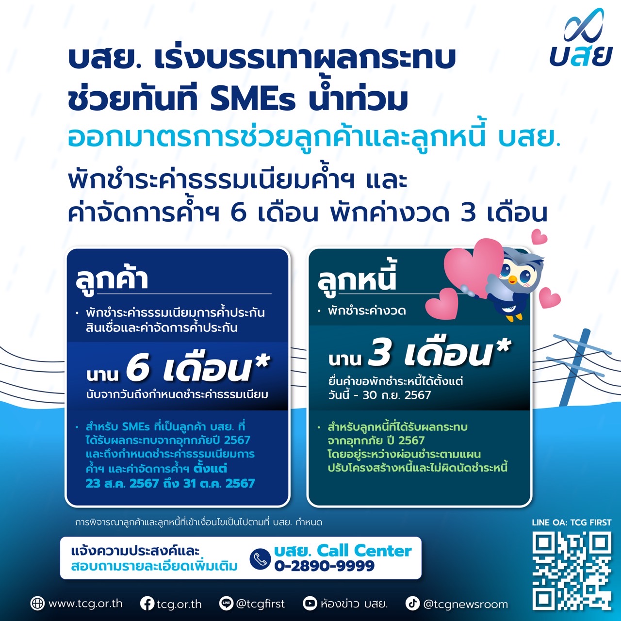 ทั้งนี้ ผู้ประกอบการ SMEs ทั้งกลุ่มลูกค้า และลูกหนี้ บสย. ที่อยู่ในพื้นที่ประสบอุทกภัยตามประกาศดังกล่าว สามารถปรึกษาหรือสอบถามข้อมูลเพิ่มเติมและรายละเอียดการเข้าร่วมมาตรการ ได้ที่สำนักงานเขตในพื้นที่ หรือ ช่องทาง LINE OA TCG First: @tcgfirst และ บสย. Call Center โทร. 02-890-9999