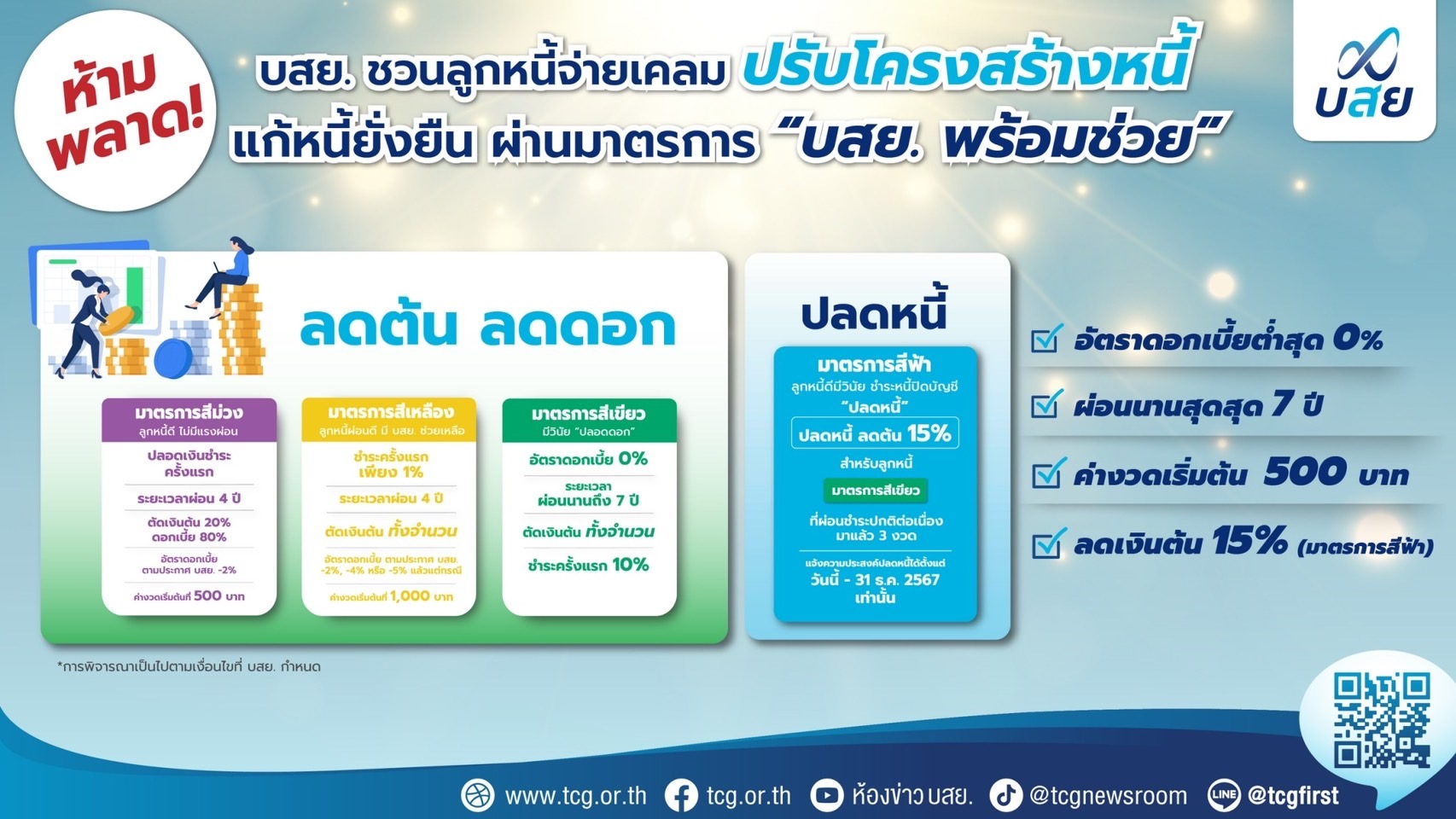 บสย. เชิญชวนลูกหนี้ SMEs ที่ถูกจ่ายเคลมหนังสือค้ำประกัน เข้าร่วมมาตรการปรับโครงสร้างหนี้ “บสย. พร้อมช่วย” ช่วยลูกหนี้ ลดต้น ลดดอก ลดภาระทางการเงิน ช่วยประคับประคองธุรกิจผ่านพ้นวิกฤต และเดินหน้าต่อไป พร้อมให้คำปรึกษาแก้หนี้ ปลดล็อกธุรกิจ ผ่านศูนย์ที่ปรึกษาทางการเงิน SMEs ฟรี! สามารถลงทะบียนร่วมโครงการได้ตั้งแต่วันนี้