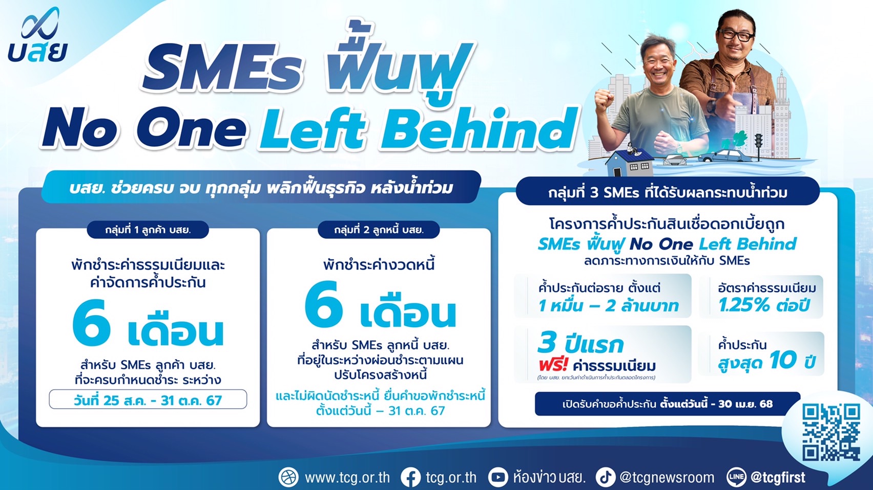 บสย. เดินหน้าช่วย SMEs ผู้ประสบภัยน้ำท่วม ครอบคลุมทุกกลุ่ม ทั้งลูกค้า-ลูกหนี้ และ SMEs ที่ได้รับผลกระทบ ผ่าน 3 มาตรการเร่งด่วน “พักชำระค่าธรรมเนียม-ค่างวด” พร้อมอัดฉีดโครงการค้ำประกันสินเชื่อดอกเบี้ยถูก “SMEs ฟื้นฟู No One Left Behind” มุ่งลดภาระทางการเงิน เสริมสภาพคล่อง ช่วย SMEs พลิกฟื้นกิจการหลังน้ำท่วม