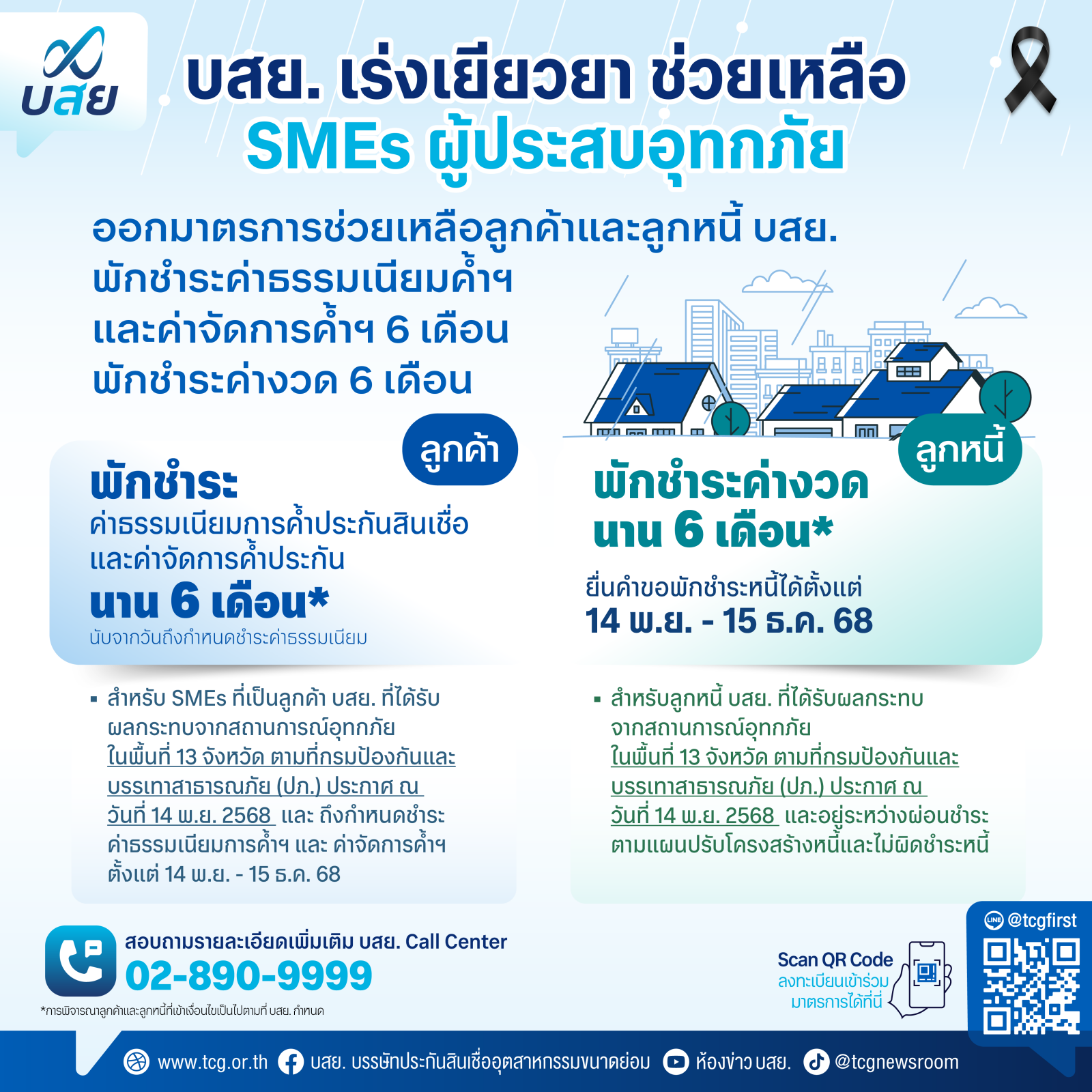 นายสิทธิกร ดิเรกสุนทร กรรมการและผู้จัดการทั่วไป บรรษัทประกันสินเชื่ออุตสาหกรรมขนาดย่อม (บสย.) กล่าวว่า จากสถานการณ์อุทกภัยในหลายพื้นที่ในภูมิภาคต่างๆ ของประเทศไทย สร้างผลกระทบต่อประชาชน และกิจการร้านค้า ผู้ประกอบการ เป็นวงกว้าง ล่าสุด บสย. ได้ออกมาตรการเร่งด่วน ช่วยเหลือลูกค้า บสย. และลูกหนี้ที่ถูกจ่ายเคลม ที่ได้รับผลกระทบให้สามารถประคับประคองธุรกิจเดินหน้าต่อไปได้ สำหรับผู้ประกอบการ SMEs ผู้ประสบอุทกภัย และมีสถานประกอบการตั้งอยู่ในพื้นที่จังหวัด ตามประกาศของ กรมป้องกันและบรรเทาสาธารณภัย (ปภ.) (ณ วันที่ 14 พฤศจิกายน 2568 มี 13 จังหวัด ได้แก่ จังหวัดพิษณุโลก นครสวรรค์ สุโขทัย อุทัยธานี สิงห์บุรี ชัยนาท อ่างทอง สุพรรณบุรี พระนครศรีอยุธยา ปทุมธานี นนทบุรี นครปฐม และอุบลราชธานี และให้รวมถึงพื้นที่ได้รับผลกระทบจากสถานการณ์อุทกภัย ตามที่ ปภ. มีการประกาศเพิ่มเติม) แบ่งเป็น 2 กลุ่ม ดังนี้