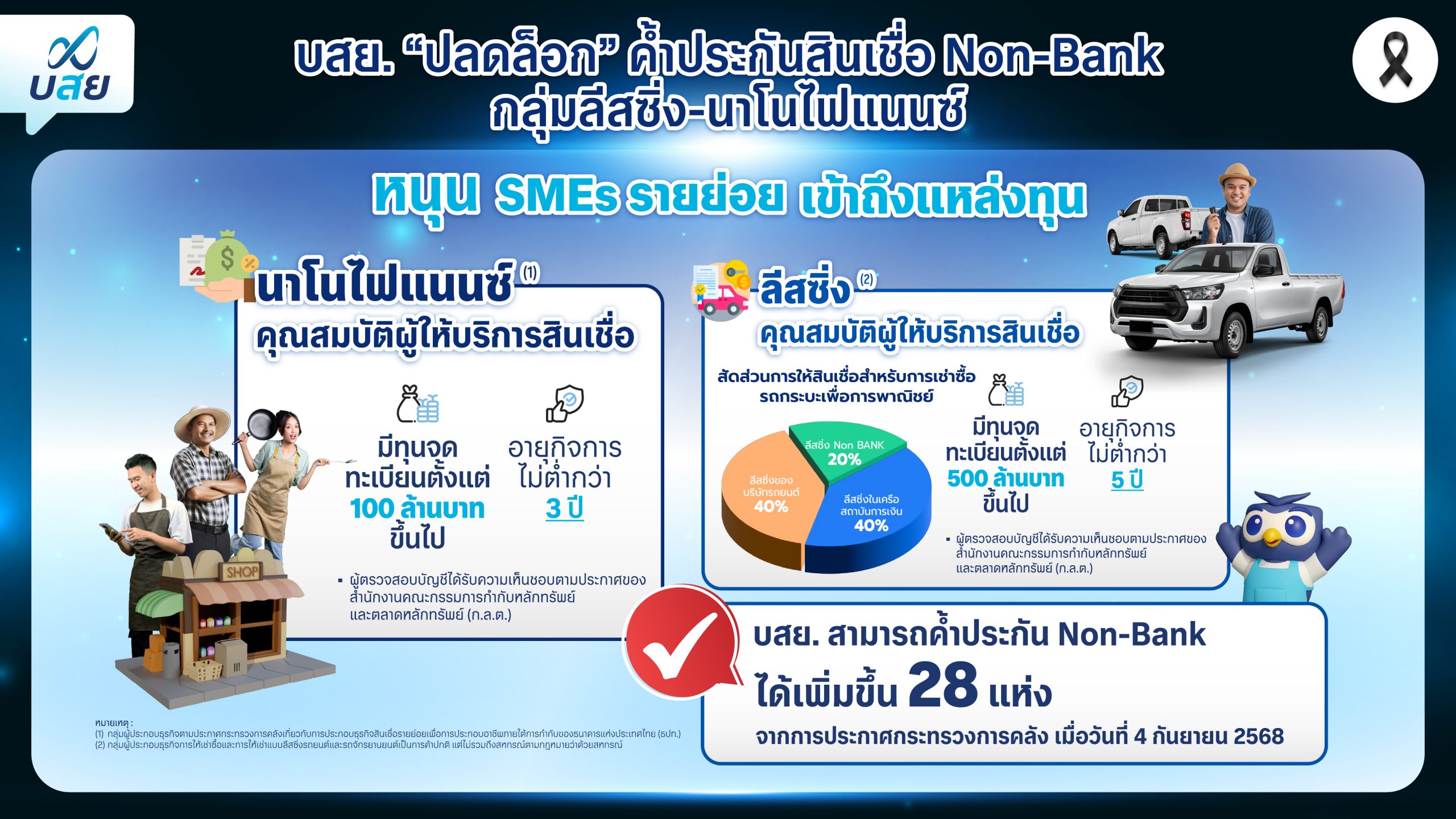 บสย. เดินหน้ายกระดับ “กลไกค้ำประกันสินเชื่อ” สู่กลไกค้ำประกันหลักเชื่อมโยงเงินทุนและโอกาสให้ SMEs เปิดยอดค้ำประกัน 11 เดือน 35,781 ล้านบาท ช่วยผู้ประกอบการเข้าถึงสินเชื่อในระบบ 45,337 ราย ชูมาตรการใหม่ “ค้ำประกันสินเชื่อ Quick Big Win” 5 หมื่นล้านบาท เติมสภาพคล่องเร่งด่วน พร้อมประกาศทิศทางปี 2569 มุ่งพลิกโฉมการช่วยเหลือ SMEs ทุกมิติ