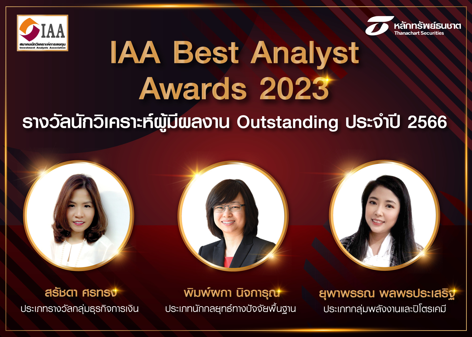 ทั้งนี้ ท่ามกลางสภาวะตลาดที่มีความผันผวนในปัจจุบัน หลักทรัพย์ธนชาตได้ใช้จุดแข็งของบริษัทผลิตบทวิเคราะห์เชิงลึกที่ทันต่อสถานการณ์ และทีมนักวิเคราะห์การลงทุนที่มีคุณภาพ เพื่อสร้างความเชื่อมั่นให้กับลูกค้าของบริษัท โดยล่าสุด หลักทรัพย์ธนชาต ได้รับรางวัลนักวิเคราะห์ผู้มีผลงาน Outstanding 3 รางวัล จากเวที IAA Best Analyst Awards 2023 โดยสมาคมนักวิเคราะห์การลงทุน ได้แก่ นางสาวพิมพ์ผกา นิจการุณ นักวิเคราะห์ผู้มีผลงาน Outstanding ประเภทนักกลยุทธ์ทางปัจจัยพื้นฐาน นางสาวสรัชดา ศรทรง ประเภทกลุ่มธุรกิจการเงิน และ นางสาวยุพาพรรณ พลพรประเสริฐ ประเภทกลุ่มพลังงานและปิโตรเคมี ซึ่งเป็นเครื่องพิสูจน์ถึงผลงานด้านงานวิเคราะห์ที่โดดเด่นและผลิตงานบทวิเคราะห์ที่มีคุณภาพ