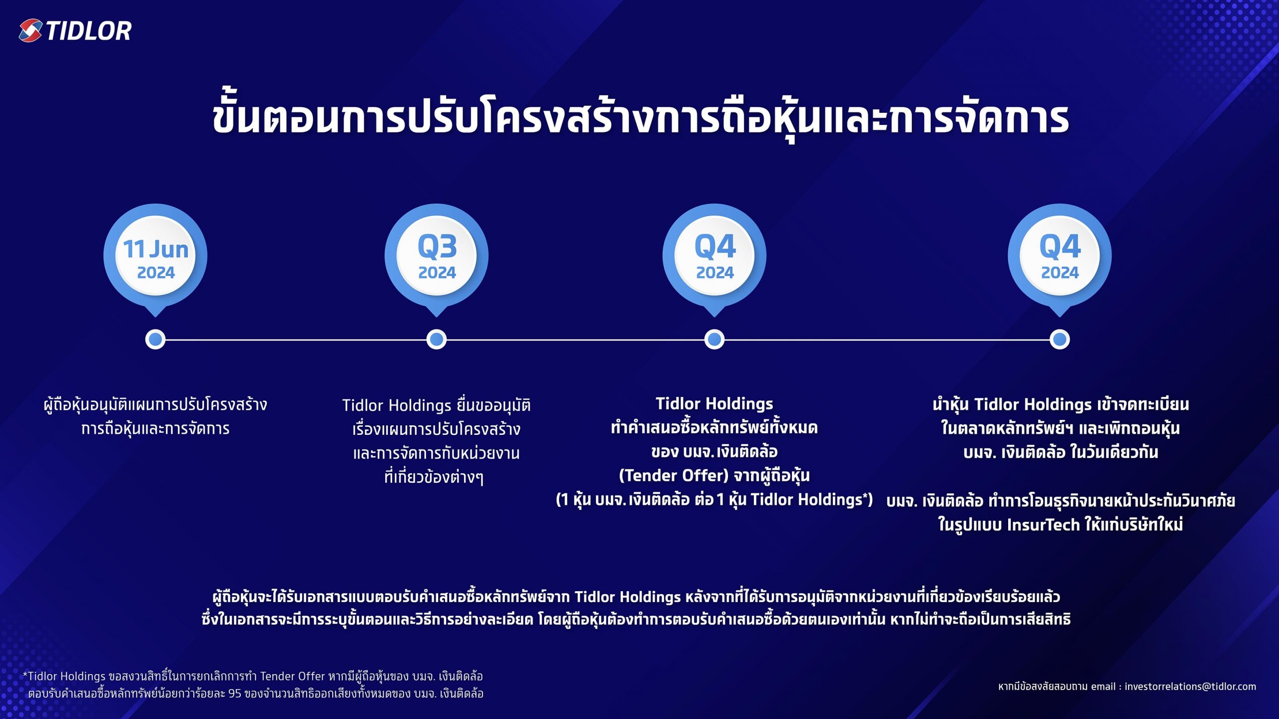 แหม! ช่วงนี้ผู้ถือหุ้น TIDLOR มีข่าวดีกันแบบรัวๆ หลังจากที่ประชุมวิสามัญผู้ถือหุ้น (e-EGM) ครั้งที่ 1/2567 ที่ผ่านมา มีมติอนุมัติแผนการปรับโครงสร้างการถือหุ้นและการจัดการด้วยคะแนนเสียงสูงถึง 100% สื่อถึงความมั่นใจในทิศทางสร้างการเติบโตของบริษัทฯ นอกจากนี้ ที่ประชุมผู้ถือหุ้นยังอนุมัติแผนการโอนธุรกิจที่เกี่ยวข้องกับธุรกิจนายหน้าประกันวินาศภัยในรูปแบบ InsurTech ไปยังบริษัทที่จะถูกจัดตั้งขึ้นใหม่ ทั้ง AREEGATOR และ heygoody ซึ่งที่ผ่านมาประสบความสำเร็จและสร้างการเติบโตได้อย่างต่อเนื่อง อีกด้วย ทั้งนี้ ในระหว่างดำเนินการปรับโครงสร้างฯ หลักทรัพย์ของ TIDLOR ยังคงสามารถทำการซื้อขายในตลาดหลักทรัพย์ฯ ตามปกติ