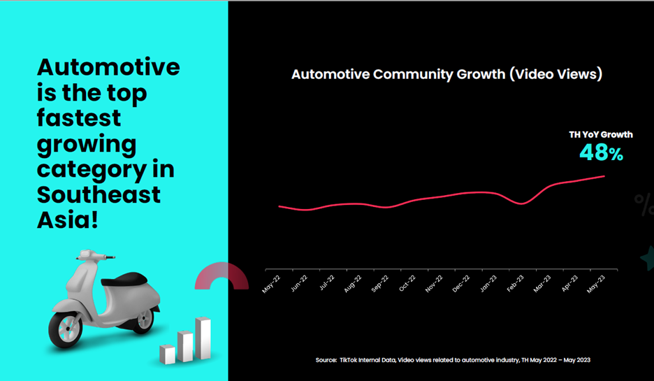 ในปี 2566 TikTok ไม่เพียงแต่ปฏิวัติวงการช้อปปิ้งและความบันเทิงเท่านั้น แต่ยังมีอิทธิพลอย่างมากต่ออุตสาหกรรมยานยนต์และการเงินอีกด้วย โดย ‘Automotive Unboxed’ แสดงให้เห็นถึงบทบาทของ TikTok ในการเปลี่ยนแปลงอุตสาหกรรมยานยนต์ ด้วยการเป็นแพลตฟอร์มที่ขับเคลื่อนการมีส่วนร่วมอย่างที่ไม่เคยเกิดขึ้นมาก่อน และมีอิทธิพลต่อการตัดสินใจของผู้บริโภคในการซื้อยานพาหนะ สะท้อนการเติบโตกว่า 48% ของยอดดูวิดีโอที่เกี่ยวข้องกับเนื้อหาเกี่ยวกับยานยนต์ในประเทศไทยเมื่อเทียบเป็นรายปีซึ่งตอกย้ำการขยายตัวอย่างรวดเร็วของหมวดหมู่นี้ ควบคู่ไปกับข้อมูลเชิงลึกที่ยังเผยให้เห็นว่าผู้ใช้ TikTok มากกว่า 40% ที่เป็นรวมไปถึงผู้ที่มีอายุมากกว่า 35 ปีมีส่วนร่วมอย่างแข็งขันกับเนื้อหาเกี่ยวกับยานยนต์ ซึ่งหลายคนอาจเป็นผู้ซื้อรถยนต์รายใหม่ที่ได้รับอิทธิพลจากเนื้อหาของ TikTok