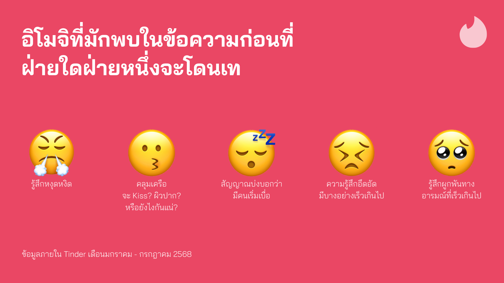 การใช้อิโมจิตั้งแต่รูปแบบคลาสสิกไปจนถึงการแสดงออกแบบคลุมเครือ ได้กลายเป็นภาษารักที่ช่วยให้การเดทของ Gen Z สื่อสารได้อย่างลึกซึ้งมากยิ่งขึ้นแทนคำพูด เพิ่มความสนุกมิติใหม่ในบทสนทนา และเผยตัวตนแบบมีเสน่ห์แทนคำพูดยาว ๆ จนกลายเป็นภาษากึ่งทางการของโลกการออกเดทในปัจจุบัน อิโมจิยอดนิยมบน Tinder ในประเทศไทยในปี 2568 มีดังนี้3