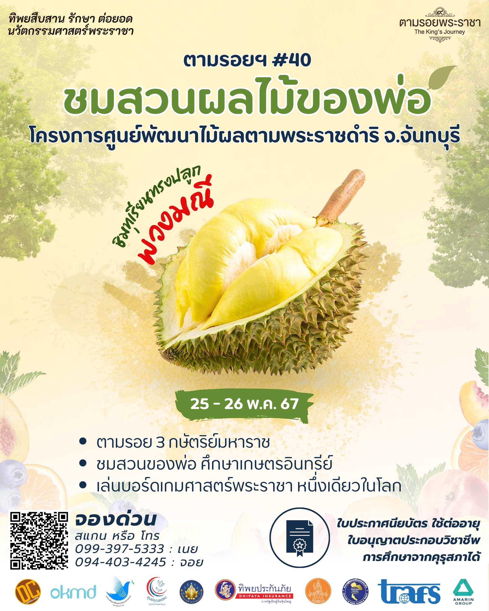 เชิญร่วมโครงการตามรอยพระราชา ครั้งที่ 40 ในวันเสาร์ที่ 25–วันอาทิตย์ที่ 26 พฤษภาคม 2567 (2 วัน 1 คืน) ณ ศูนย์พัฒนาไม้ผลตามพระราชดำริ จังหวัดจันทบุรี เปิดรับสมัครตั้งแต่วันนี้ เป็นต้นไป