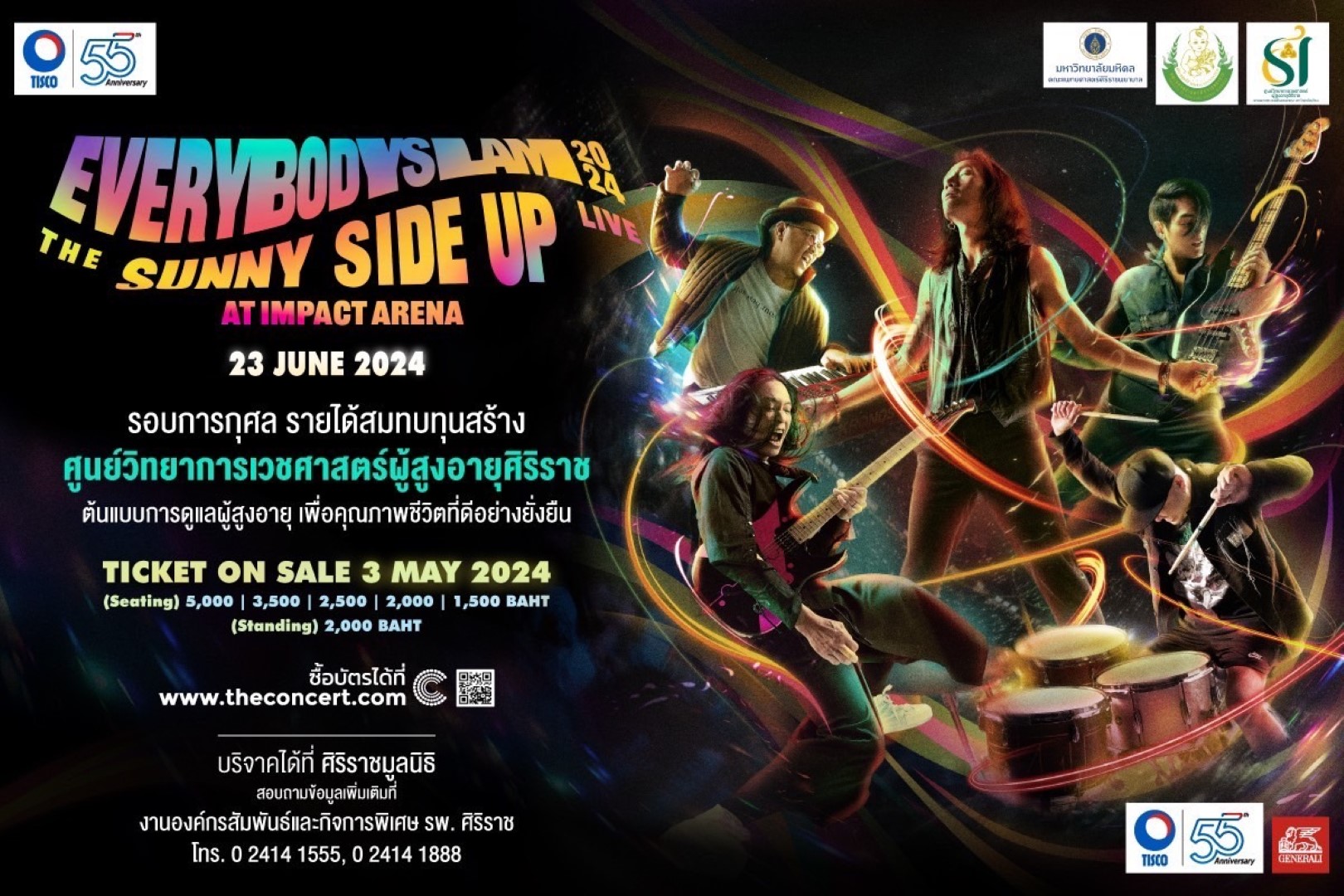 กลุ่มทิสโก้ จับมือ ศิริราชมูลนิธิ ส่งมอบความสุขผ่านคอนเสิร์ต “Everybodyslam 2024 The Sunny Side Up Live!” รอบการกุศล:กลุ่มทิสโก้ ร่วมกับศิริราชมูลนิธิ ในวันอาทิตย์ที่ 23 มิถุนายน 2567 จำหน่ายบัตรรอบประชาชนทั่วไปตั้งแต่วันที่ 3 พฤษภาคม 2567 เวลา 10.00 น. เป็นต้นไป รายได้จากการจำหน่ายบัตรไม่หักค่าใช้จ่ายนำไปสมทบทุนสร้าง “ศูนย์วิทยาการเวชศาสตร์ผู้สูงอายุศิริราช” จ.สมุทรสาคร หวังช่วยยกระดับคุณภาพชีวิตผู้สูงอายุให้พ้นระยะเจ็บป่วยเฉียบพลัน และป้องกันไม่ให้กลับมาป่วยซ้ำ ตอกย้ำการดำเนินงานครบรอบ 55 ปีของกลุ่มทิสโก้ ที่มุ่งเติบโตอย่างรับผิดชอบและยั่งยืน