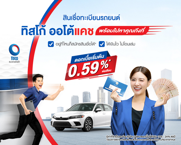 ทิสโก้ ออโต้แคช ปล่อยแคมเปญภาพยนตร์โฆษณาชุด “สินเชื่อที่เข้าใจ คนไม่มีเวลา” สินเชื่อทะเบียนรถยนต์ Delivery ที่พร้อมเดินทางไปหาคุณถึงที่ ตอบโจทย์ไลฟ์สไตล์คนยุคปัจจุบันที่เร่งรีบ พร้อมให้อัตราดอกเบี้ยสำหรับสินเชื่อทะเบียนรถ เริ่มต้นเพียง 0.59%* ต่อเดือน เลือกผ่อนชำระ ได้ตามความต้องการตั้งแต่ 6-72 เดือน ไม่ว่าจะเป็น รถเก๋ง กระบะ รถตู้ รับวงเงินสูงสุด 100%* ของราคาประเมิน ช่วยคนทำงานให้มีเงินต่อยอดธุรกิจ ไม่เสียทั้งรถ ไม่เสียทั้งเวลา