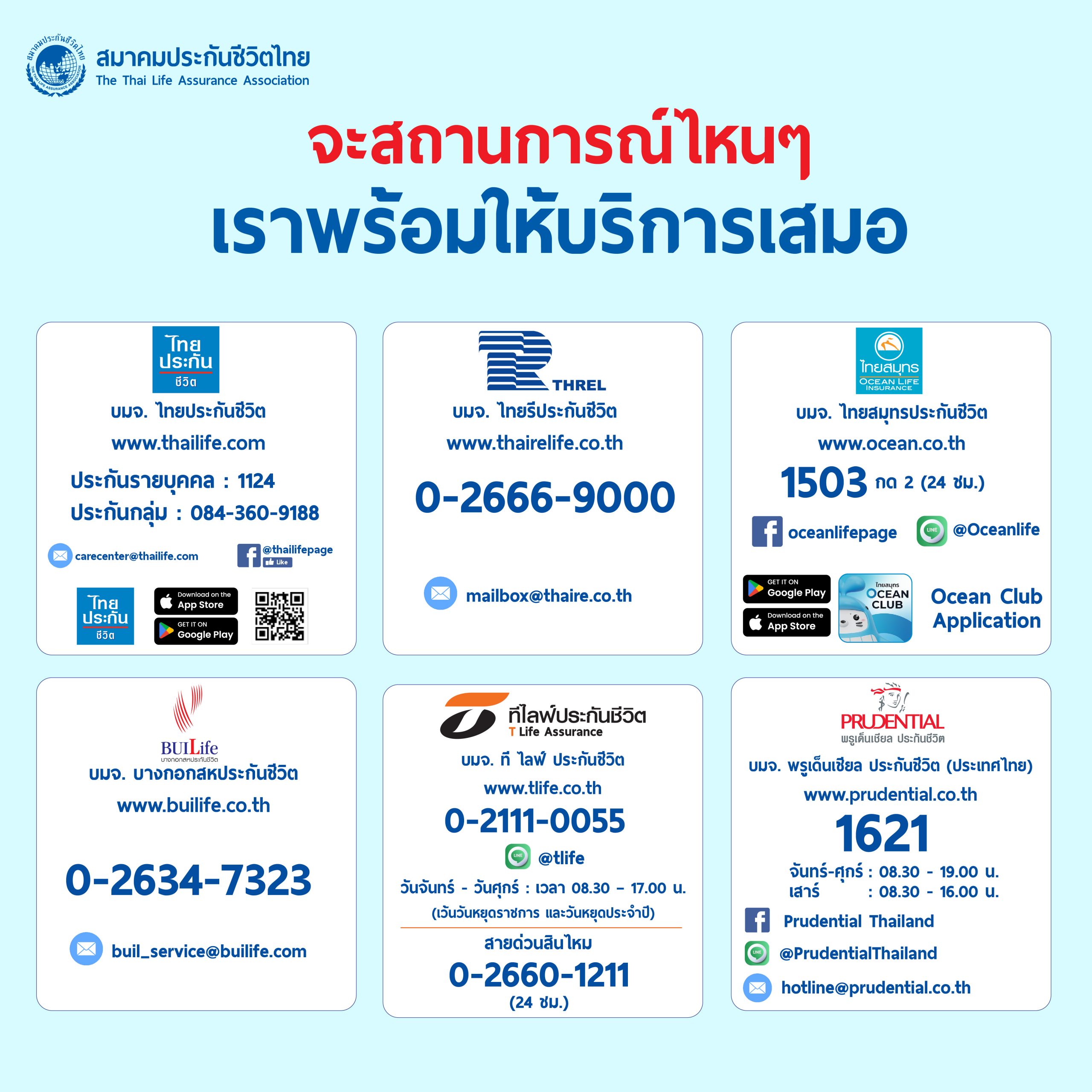 ทั้งนี้ ท่านสามารถตรวจสอบสถานะกรมธรรม์ผ่านแอปพลิเคชัน OIC connect สายด่วน คปภ. 1186 หรือสำนักงาน คปภ. จังหวัดพัทลุง สำนักงาน คปภ. จังหวัดนครศรีธรรมราช สำนักงาน คปภ. จังหวัดตรัง สำนักงาน คปภ. จังหวัดสตูล หรือขอรับบริการโดยตรงกับบริษัทประกันชีวิตที่ท่านมีกรมธรรม์ ผ่านหลากหลายช่องทางอาทิ สาขาของบริษัท ศูนย์ลูกค้าสัมพันธ์ โทร. Call Center เว็บไซต์ ช่องทางอิเล็กทรอนิกส์ แชตบอท เฟสบุ๊กไลน์ออฟฟิตเชียล รวมถึงแอปพลิเคชัน ซึ่งยังคงเปิดให้บริการต่อเนื่อง หากติดขัดเรื่องเอกสารสำหรับเรียกร้องค่าสินไหม ท่านสามารถแจ้งชื่อ-สกุล เลขที่บัตรประจำตัวประชาชน 13 หลัก บริษัทจะดำเนินการอำนวยความสะดวกให้