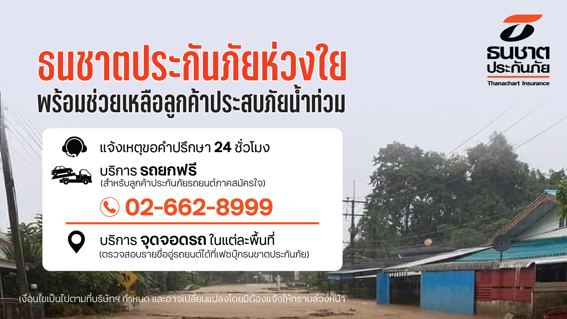 ธนชาตประกันภัย ห่วงใยลูกค้าประสบภัยน้ำท่วมในพื้นที่ภาคเหนือและภาคใต้ เร่งออกมาตรช่วยเหลือด้วยการจัดเจ้าหน้าที่รับแจ้งเหตุและให้คำปรึกษาตลอด 24 ชั่วโมง พร้อมเตรียมบริการรถยกฟรี! ให้กับลูกค้าที่ทำประกันภัยรถยนต์ภาคสมัครใจกับบริษัทฯ อีกทั้ง ผนึกกำลังกับอู่รถยนต์ในเครือจัดจุดจอดรถที่ปลอดภัยจากน้ำท่วมไว้บริการ โดยลูกค้าสามารถติดต่อแจ้งเหตุหรือสอบถามรายละเอียดเพิ่มเติมได้ที่สายด่วนแจ้งอุบัติเหตุ โทร.0-2662-8999