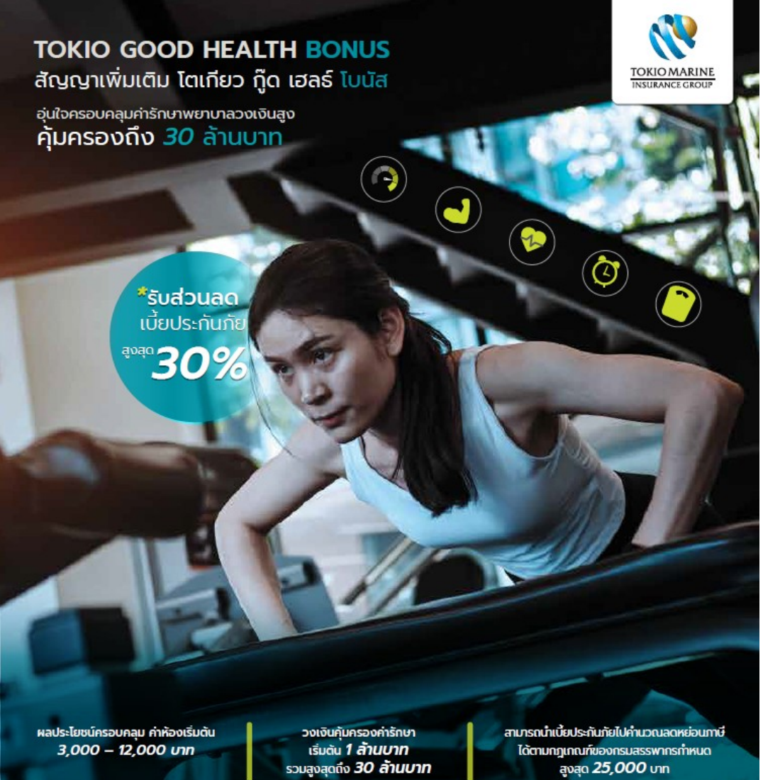 บมจ. โตเกียวมารีนประกันชีวิต (ประเทศไทย) เปิดตัวสัญญาเพิ่มเติมประกันสุขภาพรูปแบบใหม่ “โตเกียว กู๊ด เฮลธ์ โบนัส” (Tokio Good Health Bonus) มอบความคุ้มครองค่ารักษาพยาบาลวงเงินสูงเริ่มต้น 1 ล้านบาท รวมสูงสุดถึง 30 ล้านบาท พร้อมผลประโยชน์ส่วนลดเบี้ยสำหรับผู้ที่ดูแลสุขภาพดี