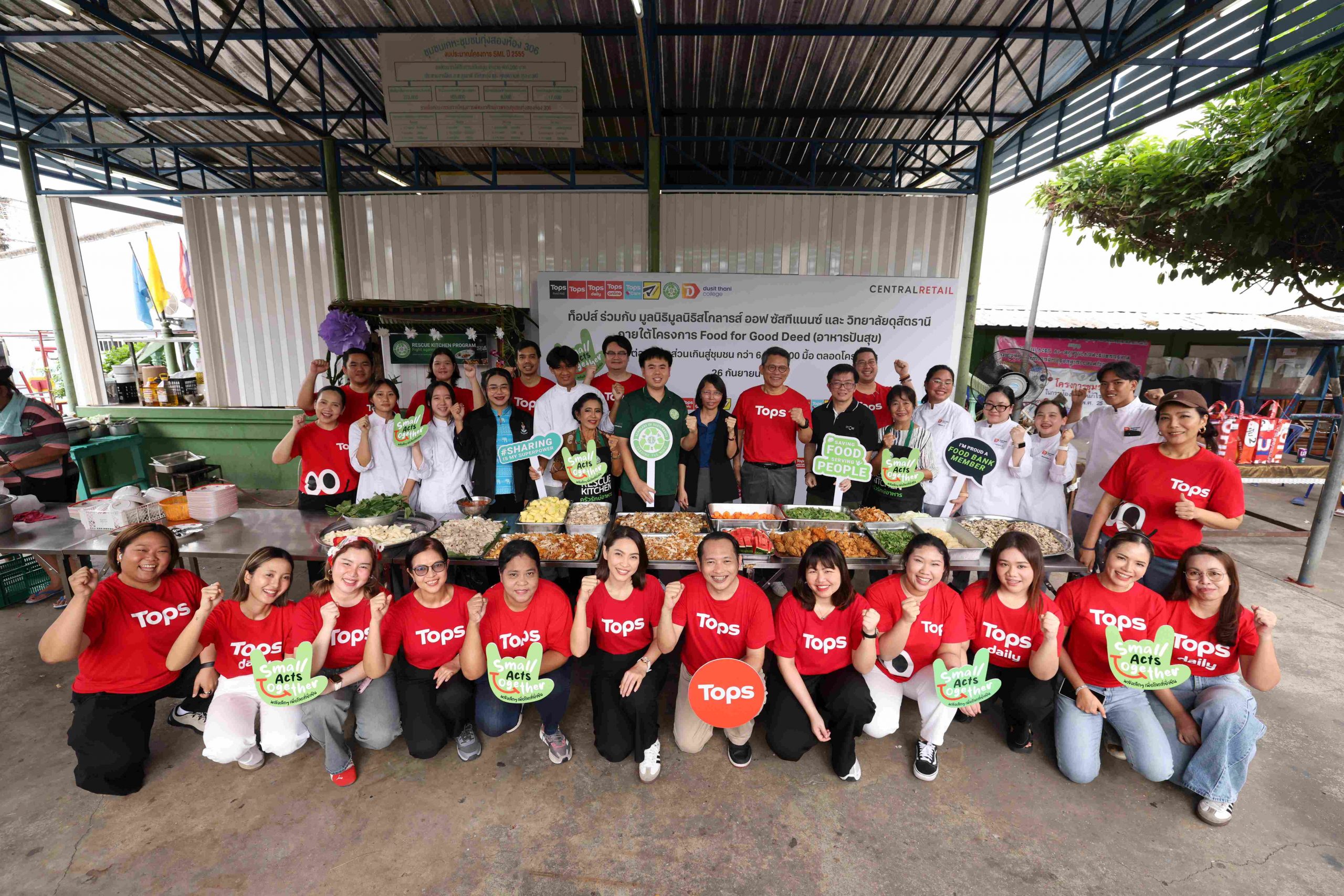 ท็อปส์ ธุรกิจกลุ่มฟู้ด ในเครือเซ็นทรัล รีเทล เร่งสปีดแผนงานด้านความยั่งยืน จับมือมูลนิธิสโกลารส์ ออฟ ซัสทีแนนซ์ (SOS Thailand) จัดกิจกรรม “Food for Good Deed (อาหารปันสุข)” สานต่อภารกิจ “Zero Food Waste” การลดปริมาณขยะอาหารให้เหลือน้อยที่สุดหรือเป็นศูนย์ผ่านการเปลี่ยนอาหารส่วนเกินให้กลายเป็นเมนูอิ่มท้องที่สะอาด ปลอดภัย และอุดมด้วยคุณค่าทางโภชนาการ เพื่อส่งต่อสู่ชุมชนอย่างต่อเนื่องเป็นปีที่ 6 โดยสามารถส่งมอบอาหารส่วนเกินจากซูเปอร์มาร์เก็ตสู่ชุมชนรวมแล้วกว่า 6.7 ล้านมื้อ ในปีนี้ ท็อปส์ได้ขยายจำนวนสาขาที่เข้าร่วมโครงการให้ครอบคลุมทั้งในเขตเมืองและภูมิภาคอีกกว่า 44 สาขา รวมทั้งสิ้น 106 สาขาทั่วประเทศ ตอกย้ำความมุ่งมั่นเชิงกลยุทธ์ของท็อปส์ในการจัดการอาหารอย่างมีประสิทธิภาพ ลดอาหารที่อาจกลายเป็นขยะ (Food Waste) ที่ส่งผลต่อปัญหาโลกร้อน พร้อมทั้งยกระดับคุณภาพชีวิตของผู้คนและสร้างความยั่งยืนให้แก่ชุมชนอย่างเป็นรูปธรรม โดยตั้งเป้าลดปริมาณก๊าซคาร์บอนไดออกไซด์ที่เกิดจากขยะอาหารกว่า 4,000 ตันคาร์บอนไดออกไซด์เทียบเท่า ภายในปี 2569