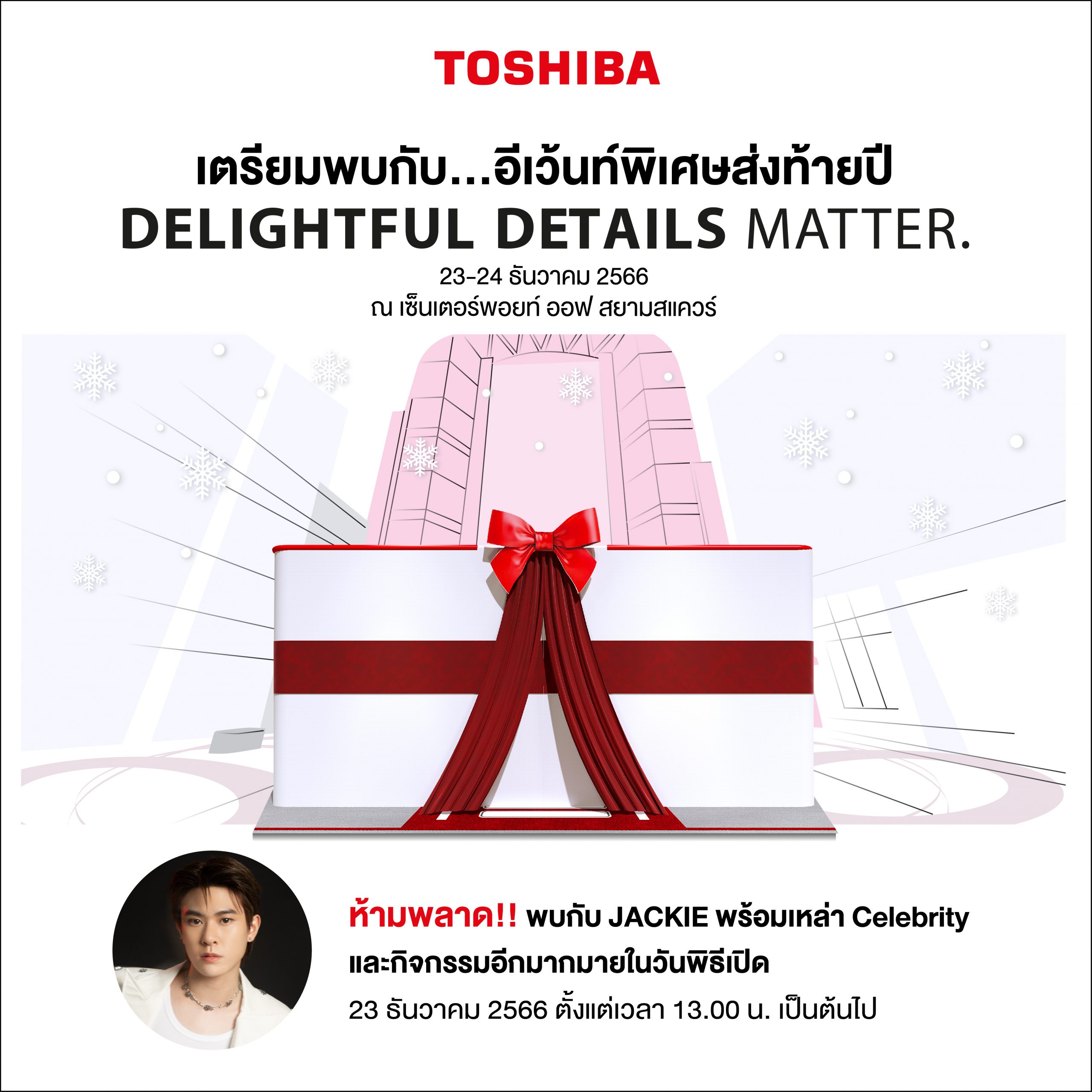 โตชิบา ไทยแลนด์ ส่งความสุขท้ายปีด้วยการเปิดกล่องของขวัญชิ้นใหญ่ ด้วยแคมเปญ “Delightful Details Matter” กระตุ้นยอดขายไตรมาสสี่ ยกขบวนเครื่องใช้ไฟฟ้าราคาพิเศษ ทั้งลด แถม ผ่อน 0% สูงสุดนาน 10 เดือน ต้อนรับเทศกาลแห่งการมอบของขวัญ ทั้งคริสต์มาสและปีใหม่ที่ใกล้จะมาถึงนี้ สามารถเลือกซื้อได้จากร้านค้าตัวแทนจำหน่ายโตชิบาทั่วประเทศที่ร่วมรายการ นอกจากนี้ โตชิบายังเนรมิตกล่องของขวัญขนาดใหญ่ไว้ใจกลางเมือง จัดแสดงสินค้าไฮไลท์ที่น่าสนใจ พร้อมกิจกรรมมากมายในอีเวนท์สุดพิเศษ เพื่อสร้างการรับรู้ไปยังลูกค้ากลุ่ม Young Generation ระหว่างวันที่ 23-24 ธันวาคมนี้ ที่เซ็นเตอร์พอยท์ ออฟ สยามสแควร์ พบแขกสุดพิเศษแจ๊คกี้ จักริน นักร้องหนุ่มสุดเท่จาก TRINITY ที่จะมาร่วมสร้างความสุข วันที่ 24 ธันวาคม เวลา 13:00 น. เป็นต้นไป พร้อมเหล่าเซเลบริตี้มากมายที่แวะเวียนมาร่วมกิจกรรมตลอดระยะเวลาจัดงาน อาทิ โปรโมชั่นแลกซื้อผลิตภัณฑ์เครื่องใช้ไฟฟ้าจากโตชิบา ในราคาเพียง 55 บาท* (จำนวนจำกัดตามรอบกิจกรรม) กิจกรรม Cooking Show ร่วมชิมเมนูอร่อยและดีต่อสุขภาพที่ทำจากเครื่องใช้ไฟฟ้าโตชิบา กิจกรรม Workshop ทำการ์ดเก๋ๆ โดยศิลปิน Calligraphy เป็นต้น
