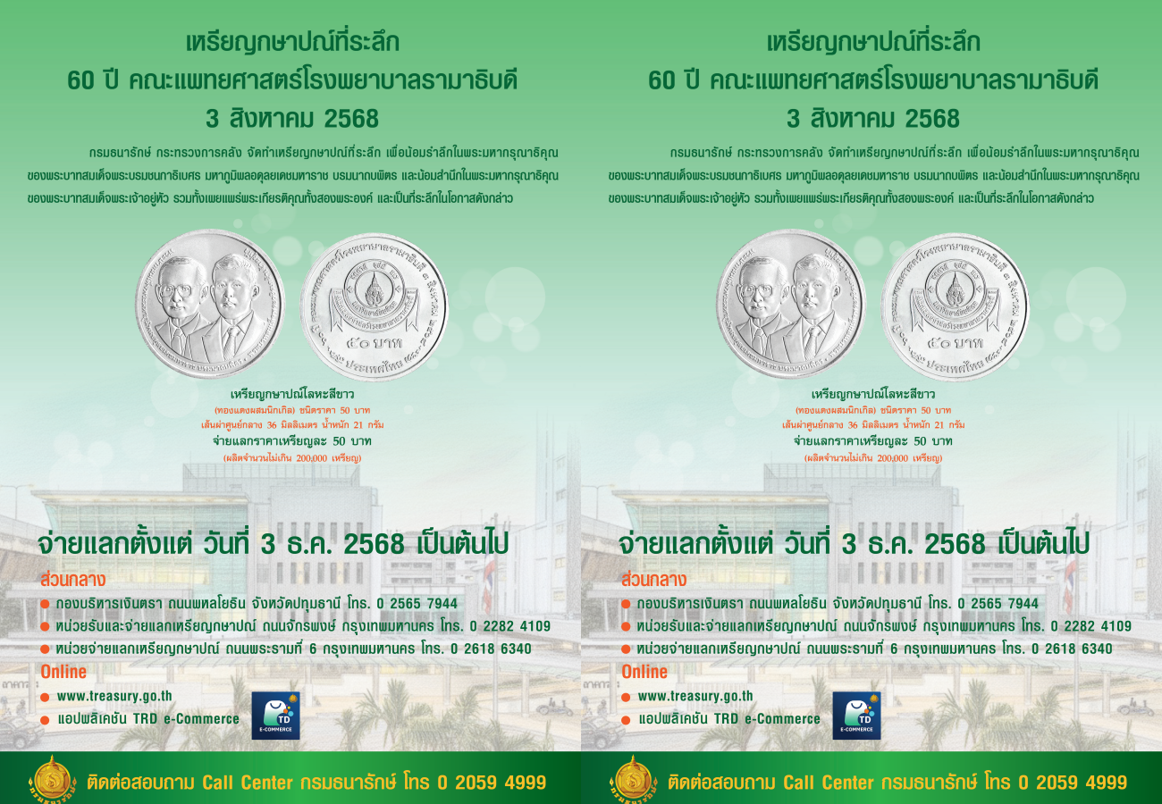 นายอัครุตม์ สนธยานนท์ อธิบดีกรมธนารักษ์ เปิดเผยว่ากรมธนารักษ์ กระทรวงการคลัง จัดทำเหรียญกษาปณ์ที่ระลึก 60 ปี คณะแพทยศาสตร์โรงพยาบาลรามาธิบดี 3 สิงหาคม 2568 เพื่อน้อมรำลึกในพระมหากรุณาธิคุณของพระบาทสมเด็จพระบรมชนกาธิเบศร มหาภูมิพลอดุลยเดชมหาราช บรมนาถบพิตร และน้อมสำนึกในพระมหากรุณาธิคุณของพระบาทสมเด็จพระเจ้าอยู่หัว รวมทั้งเผยแพร่พระเกียรติคุณทั้งสองพระองค์ และเป็นที่ระลึกในโอกาสดังกล่าว โดยจัดทำเป็นเหรียญกษาปณ์โลหะสีขาว (ทองแดงผสมนิกเกิล) ชนิดราคา 50 บาท ประเภทธรรมดา ขนาดเส้นผ่าศูนย์กลาง 36 มิลลิเมตร น้ำหนัก 21 กรัม มีลวดลาย