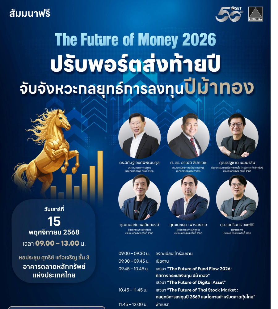 บริษัทหลักทรัพย์ ทรีนีตี้ จำกัด ร่วมกับ ตลาดหลักทรัพย์แห่งประเทศไทย (SET) จัดงานสัมมนาใหญ่ส่งท้ายปี เพื่อให้นักลงทุนเตรียมความพร้อมและปรับกลยุทธ์พอร์ตการลงทุนรับ “ปีม้าทอง” ในหัวข้อ “The Future of Money 2026: ปรับพอร์ตส่งท้ายปี จับจังหวะกลยุทธ์การลงทุนปีม้าทอง”