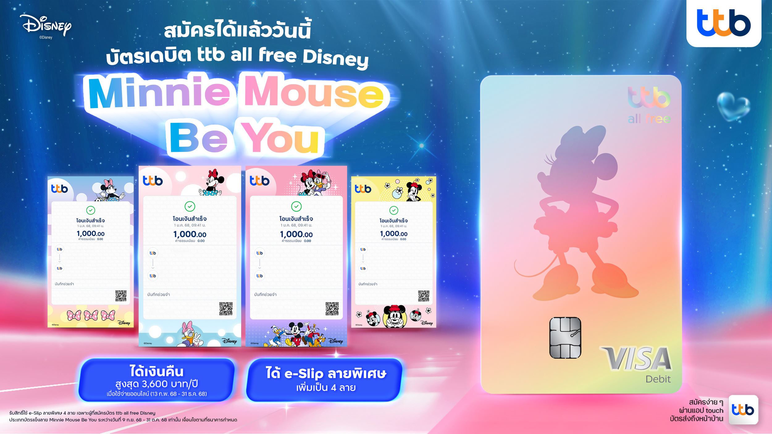 บัตรเดบิต ทีทีบี ออลล์ฟรี ดิสนีย์ ลาย “มินนี่ เมาส์ บี ยู” พร้อมให้ลูกค้าสมัครได้ด้วยตนเองทางแอป ทีทีบี ทัช เว็บไซต์ทีทีบี หรือที่ทีทีบีทุกสาขา ตั้งแต่วันที่ 9 กันยายน 2568 นี้เป็นต้นไป บัตรเดบิต ทีทีบี ออลล์ฟรี ดิสนีย์ บัตรเดียวที่ตอบโจทย์ทุกไลฟ์สไตล์ให้คุณใช้ชีวิตทางการเงินได้อัศจรรย์ พร้อมรับสิทธิประโยชน์แบบจัดเต็มมากมาย รวมทั้งกิจกรรมและแคมเปญแบบเอ็กซ์คลูซีฟอย่างต่อเนื่องที่จะทำให้ลูกค้าเข้าถึงประสบการณ์ความสนุก ความคุ้มค่าจากการใช้จ่ายในทุกๆ วัน ตลอดทั้งปี