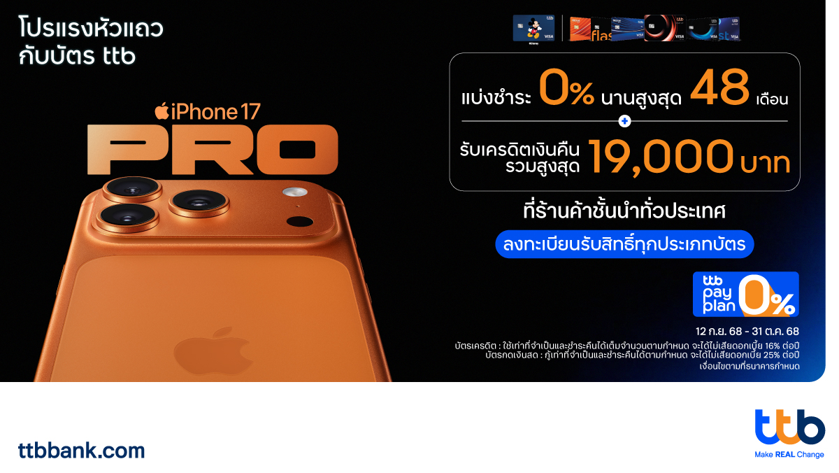 เมื่อซื้อ iPhone 17 ทุกรุ่นที่ร่วมรายการ และมียอดแบ่งชำระตั้งแต่ 30,000 บาทขึ้นไป / เซลล์สลิป กับร้านค้าพาร์ทเนอร์ชั้นนำทั่วประเทศ อาทิ AIS Shop และ AIS Telewiz, True Shop และ Dtac Shop, True Store Online และ dtac online store, Studio7, BaNANA, Advice และ Advice iStore, iStudio by Copperwired, UStore by Copperwired, dotlife, Tech House, iStudio by SPVi, Mobi by SPVi, U.Store by SPVi, iStudio by UFicon, U•Store by Uficon และทางออนไลน์ www.UFicon.com, Power Buy, Jaymart, IT City, J.I.B., JIB Mobile และ TG รวมถึงการสั่งซื้อผ่านช่องทางออนไลน์ Shopee Mall และ LazMall รับโปรโมชันที่คุ้มค่า ครอบคลุมและตอบโจทย์ทุกสไตล์ ตั้งแต่วันที่ 12 กันยายน 2568–31 ตุลาคม 2568