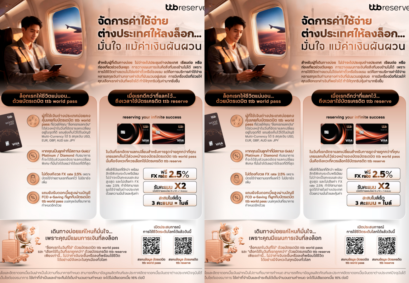 ทุกครั้งที่เก็บกระเป๋าออกเดินทาง อาจไม่ได้มีแค่พาสปอร์ตและตั๋วเครื่องบิน แต่ควรมี “แผนการเงินที่ดี” ร่วมทางเสมอ เพราะในวันที่ค่าเงินผันผวน คุณไม่จำเป็นต้องหยุดใช้ชีวิต เพียงแค่รู้จัก “ล็อกเรทในวันที่ใช่” ด้วยบัตรเดบิต ttb world pass และ “เลือกใช้ในวันที่เรทถูกกว่า” ด้วยบัตรเครดิต ttb reserve เพียงเท่านี้… ไม่ว่าค่าเงินจะขึ้นหรือลงก็พร้อมใช้ชีวิตได้อย่างมีจังหวะในทุกเมืองทั่วโลก