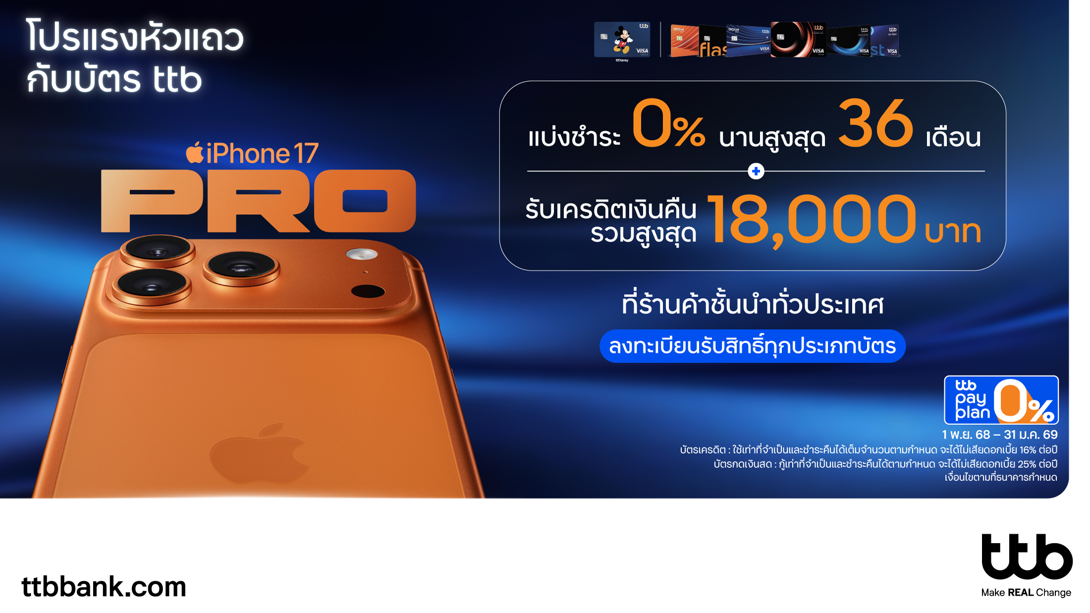 โดยล่าสุดทีทีบีมอบสิทธิพิเศษสำหรับผู้ถือบัตรเครดิต ttb บัตรเครดิต ttb Global House บัตรเครดิต ttb Disney และบัตรกดเงินสด ttb เมื่อซื้อ iPhone 17 ทุกรุ่นที่ร่วมรายการ รับสิทธิ์แบ่งชำระ 0% นานสูงสุด 36 เดือน พร้อมรับเครดิตเงินคืนรวมสูงสุด 18,000 บาท เมื่อมียอดแบ่งชำระตั้งแต่ 30,000 บาทขึ้นไป / เซลล์สลิป และยังสามารถแลกคะแนนรับเครดิตเงินคืนสูงสุดถึง 15% เมื่อใช้คะแนนสะสมทุก 1,000 คะแนน และมียอดแบ่งชำระ 0% ตั้งแต่วันที่ 1 พฤศจิกายน 2568–31 มกราคม 2569 เพื่อยกระดับประสบการณ์การผ่อนชำระให้คุ้มค่ายิ่งขึ้นกับร้านค้าพาร์ทเนอร์ชั้นนำทั่วประเทศ