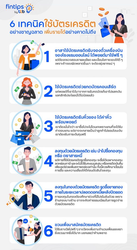 นี่คือ 6 เทคนิค ในการใช้บัตรเครดิตอย่างชาญฉลาด หากใช้บัตรเครดิตให้เป็นประโยชน์ครอบคลุมทุกด้าน ก็จะเป็นเครื่องมือทำเงินรูปแบบใหม่ เพิ่มรายได้อย่างคาดไม่ถึง อย่างไรก็ตามการอ่านเงื่อนไข และข้อมูลเป็นเรื่องสำคัญก่อนทำธุรกรรมทางการเงิน เพื่อจะได้ไม่พลาดสิทธิประโยชน์ที่ผู้ถือบัตรควรได้รับ และทำให้มีชีวิตทางการเงินที่ดีได้ตามแผนที่วางไว้