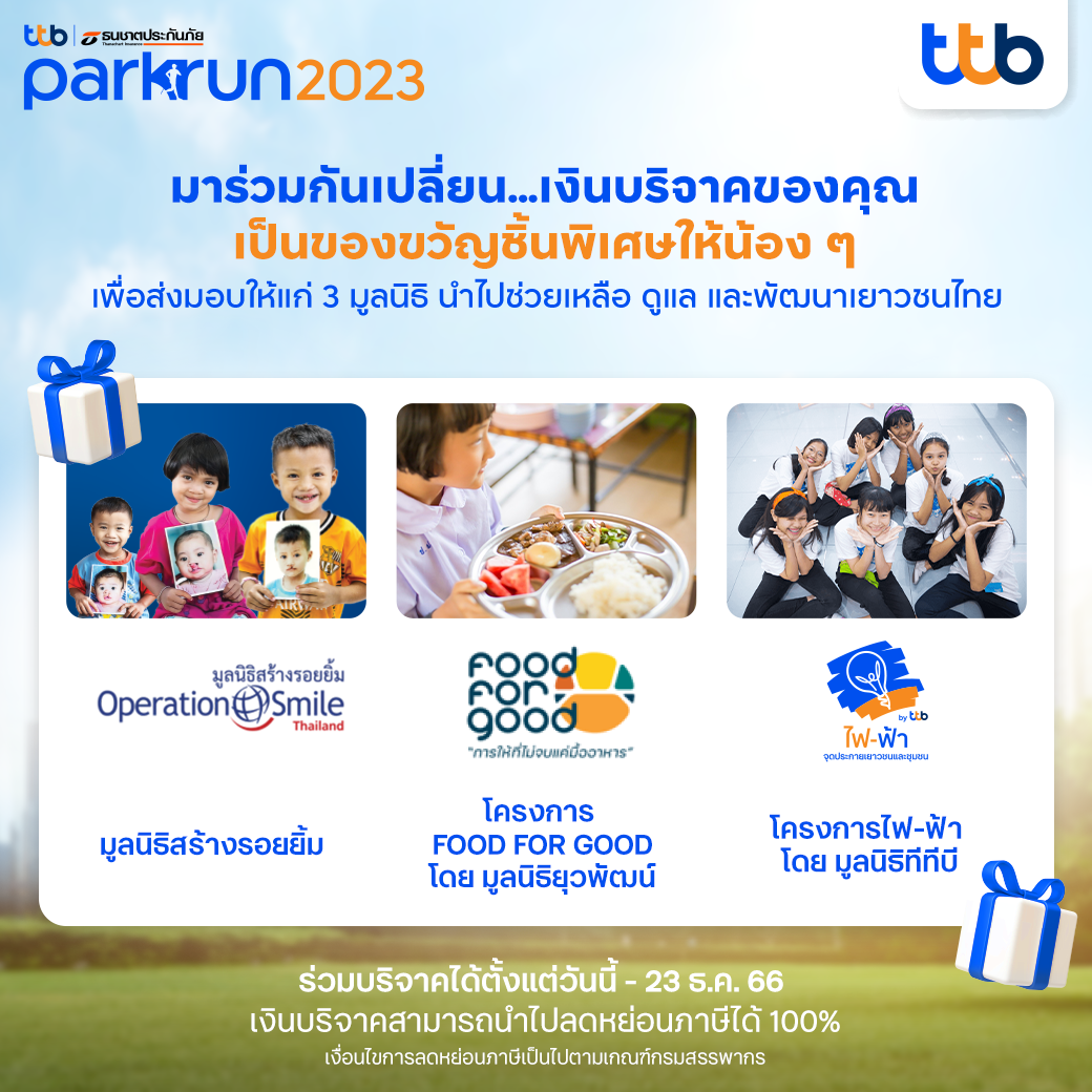 ทีทีบี และธนชาตประกันภัย ขอบคุณนักวิ่งทุกคนจากทั่วประเทศที่ให้การตอบรับในกิจกรรมเดิน-วิ่งมินิมาราธอนการกุศลแห่งปี “ทีทีบี l ธนชาตประกันภัย พาร์ครัน 2023” ที่จะจัดงานวิ่งในสวนขึ้นในวันที่ 23 ธันวาคม 2566 ซึ่งบัตรวิ่งทั้งในรูปแบบ Parkrun วิ่งในสวน และ Virtual Parkrun วิ่งสะสมระยะ ได้ปิดการจำหน่ายเป็นที่เรียบร้อย ทั้งนี้ ยังเปิดให้ผู้ที่สนใจเข้าร่วมกิจกรรมสามารถร่วมบริจาคได้จนถึงวันที่ 23 ธันวาคมนี้ โดยเงินบริจาคนำไปลดหย่อนภาษีได้ และรายได้ทั้งหมดจากการจัดกิจกรรม ไม่หักค่าใช้จ่ายจะถูกนำไปใช้เพื่อส่งต่อโอกาสให้เด็กไทย เดินหน้าพัฒนาศักยภาพ สร้างสุขภาพที่แข็งแรง โภชนาการที่ดี และการเรียนรู้ให้กับน้อง ๆ ผ่าน 3 มูลนิธิ ได้แก่