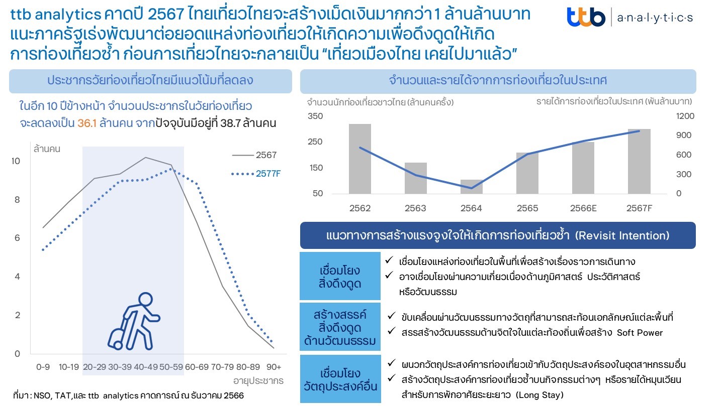 ศูนย์วิเคราะห์เศรษฐกิจ ทีทีบี หรือ ttb analytics คาดปี 2567 การท่องเที่ยวในประเทศเตรียมสร้างประวัติศาสตร์จำนวนนักท่องเที่ยวในประเทศเป็นปีที่ 2 ติดต่อกันสร้างเม็ดเงินกว่า 1 ล้านล้านบาท ภายใต้ความกังวลจากโครงสร้างประชากรที่ลดลงและการดึงดูดให้เกิดการท่องเที่ยวซ้ำ (Revisit Intention) แนะภาครัฐเร่งพัฒนาต่อยอดขับเคลื่อนจุดเด่นเชิงวัฒนธรรม ผนวกกับวัตถุประสงค์พิเศษ ก่อนการเที่ยวไทยจะกลายเป็น “เที่ยวเมืองไทย เคยไปมาแล้ว”