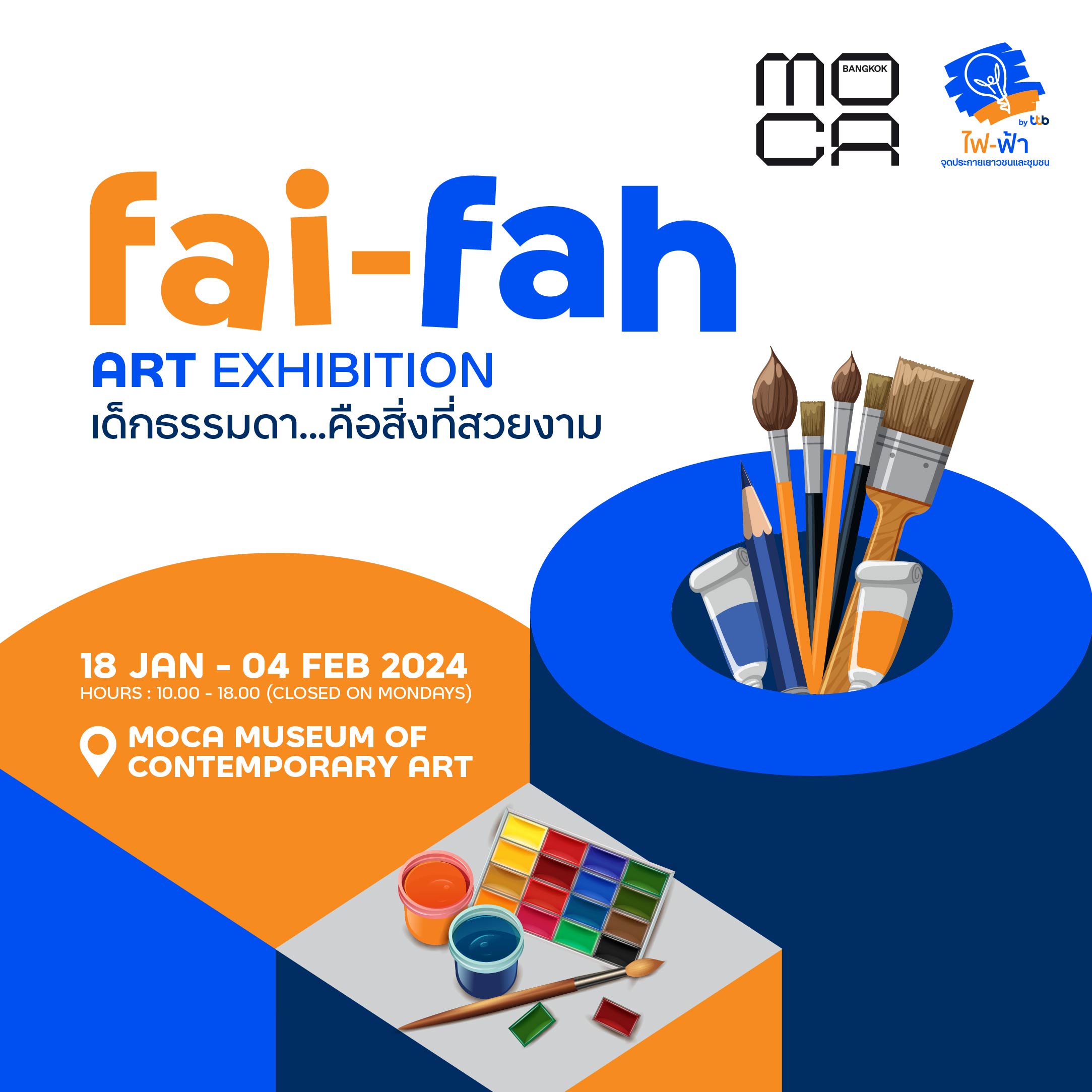 สำหรับผู้ที่สนใจเข้าชมนิทรรศการผลงานศิลปะ fai-fah Art Exhibition 2024 จะจัดขึ้นระหว่างวันที่ 18 มกราคม – 4 กุมภาพันธ์ 2567 ณ พิพิธภัณฑ์ศิลปะไทยร่วมสมัย (MOCA BANGKOK) พิเศษ! เปิดให้เข้าชมฟรี! เพียงแจ้งความประสงค์เข้าชมนิทรรศการของเด็กไฟ-ฟ้า (สำหรับห้องนิทรรศการอื่นๆ เสียค่าเข้าชมของพิพิธภัณฑ์ตามปกติ)
